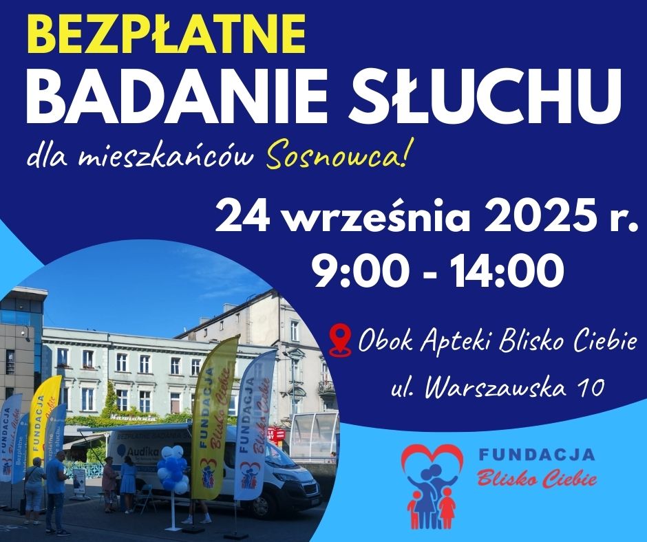 24 września 2025 r. w godz. 9:00-14:00, odbędzie się bezpłatna akcja profilaktyczna przesiewowego badania słuchu dla mieszkańców Sosnowca. Badania będą prowadzone w specjalistycznym słuchobusie, który stanie przy Aptece Blisko Ciebie, ul. Warszawska 10 w Sosnowcu.