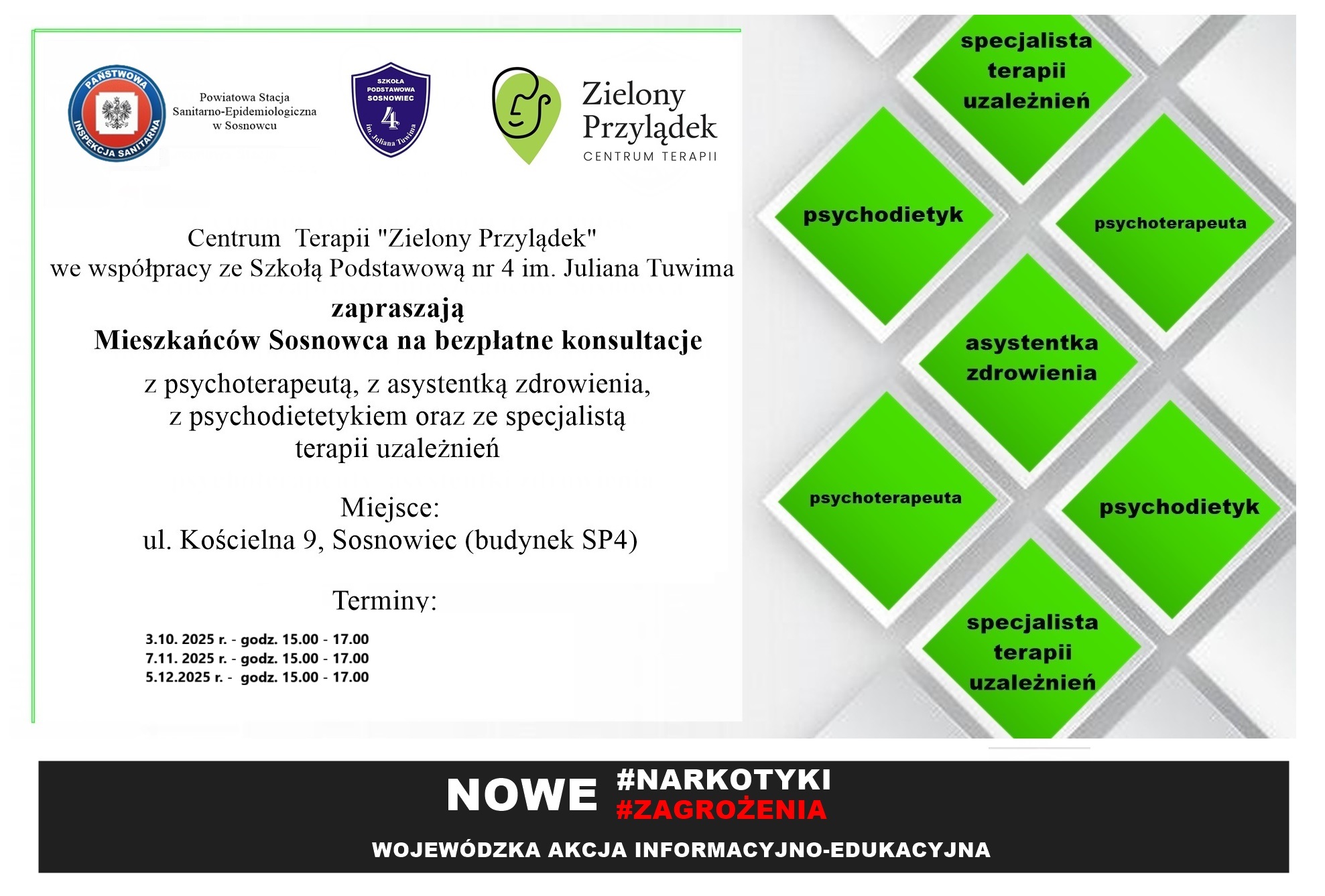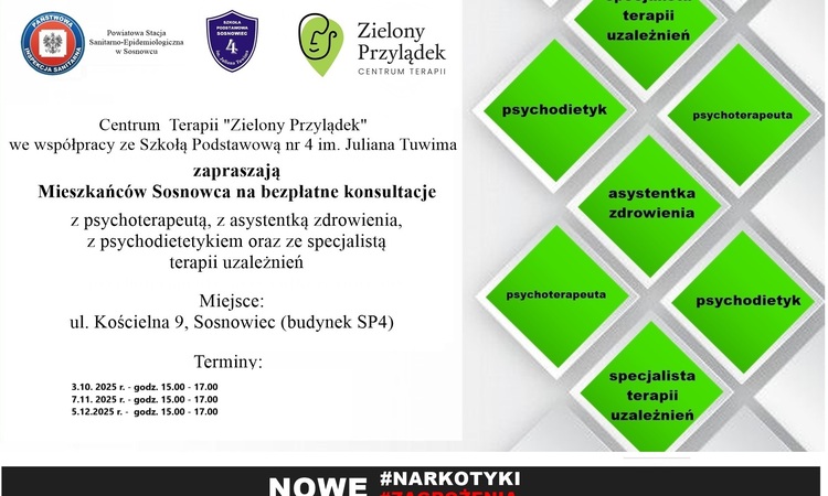 Centrum Terapii “Zielony Przylądek” we współpracy ze Szkołą Podstawową nr 4 im.J.Tuwima  zapraszają mieszkańców  Sosnowca na bezpłatne konsultacje z psychoterapeutą,specjalistą terapii uzależnień. Najbliższe spotkanie zaplanowano 7 listopada w godz.od 15.00 do 17.00 przy ul.Kościelnej 9 w Szkole Podstawowej nr 4.
