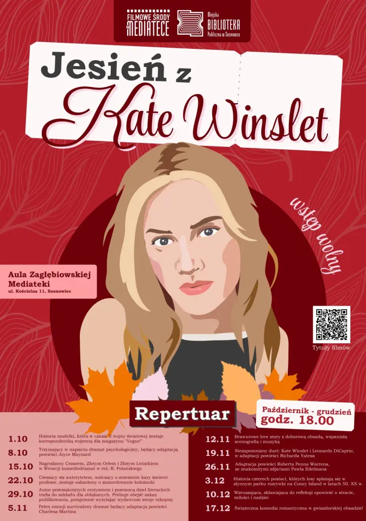 Październikowe, listopadowe i grudniowe wieczory wypełnią nam porywające filmy – dramaty i komedie – ze znaną i lubianą, obchodzącą w tym roku 50. urodziny aktorką – Kate Winslet! Na ekranie pojawią się dodatkowo m.in. Alexander Skarsgård, Jodie Foster, Christoph Waltz, Kevin Spacey, Geoffrey Rush, Joaquin Phoenix, Susan Sarandon, Christopher Walken, Leonardo DiCaprio, Sean Penn, Jude Law, Anthony Hopkins, Will Smith, Helen Mirren, Cameron Diaz i wielu innych. To będzie prawdziwie gwiazdorska jesień!!! Wstęp wolny.