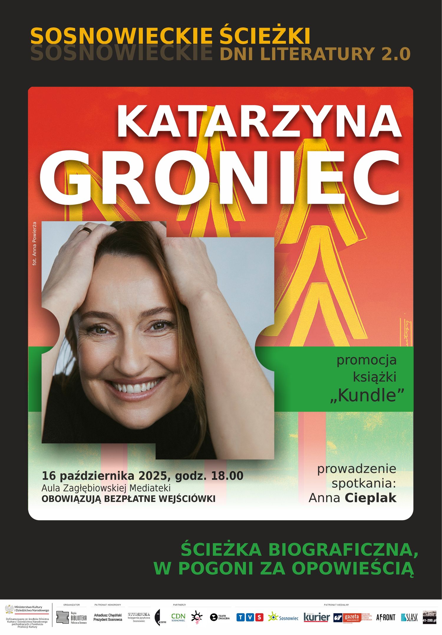 Miejska Biblioteka Publiczna w Sosnowcu – Organizator Sosnowieckich Ścieżek – serdecznie zaprasza 16 października 2025 o godz. 18.00 do Auli Zagłębiowskiej Mediateki na spotkanie z Katarzyną Groniec, promujące jej autobiograficzną książkę „Kundle”.