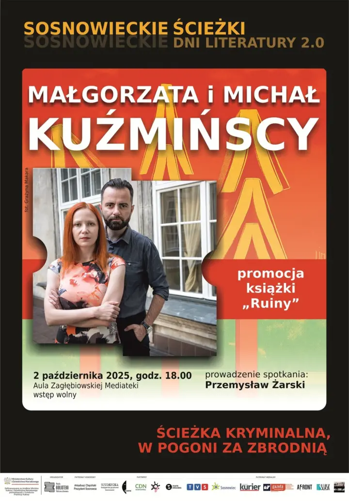 Prowadzenie: Przemysław Żarski. Wstęp wolny! Spotkanie odbędzie się w ramach „Ścieżki kryminalnej, w pogoni za zbrodnią”. Kuźmińscy są autorami serii powieści etnokryminalnych o parze nieszablonowych śledczych: antropolożce kulturowej Ance Serafin i dziennikarzu Sebastianie Strzygoniu. Małgorzata Kuźmińska jest z wykształcenia i zamiłowania kulturoznawczynią, zawodowo zajmuje się zarządzaniem w branży IT. Michał Kuźmiński jest z kolei dziennikarzem i redaktorem „Tygodnika Powszechnego”. W 2025 Sky Showtime nakręcił serial na podstawie pierwszego tomu ich serii – „Śleboda”, w którym zagrała Maria Dębska i Maciej Musiał.