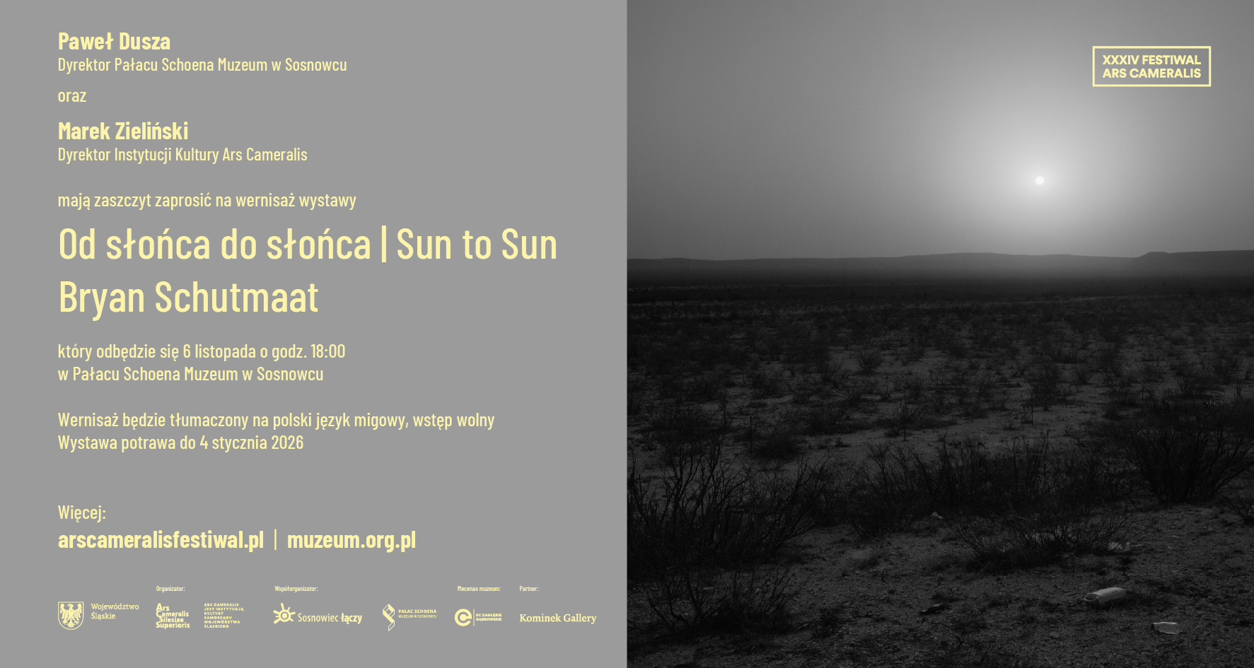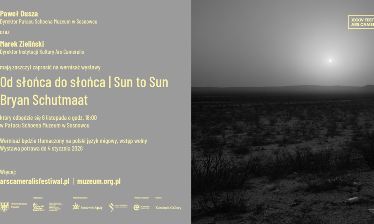 Paweł Dusza – Dyrektor Pałacu Schoena Muzeum w Sosnowcu i Marek Zieliński – Dyrektor I.K. Ars Cameralis serdecznie zapraszają do sosnowieckiego Muzeum 6 listopada o godz. 18.00 na wernisaż prac fotograficznych “Od słońca do słońca|Sun to Sun. Bryan Schutmaat”.