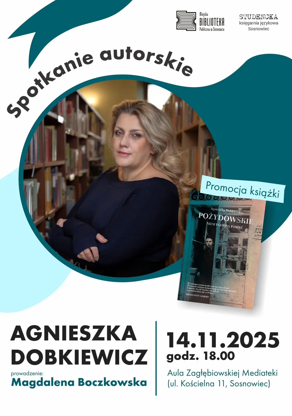 Rozmowa dotyczyć będzie przede wszystkim jej ostatniej książki “Pożydowskie. Niewygodna pamięć”, a odbędzie się w Auli Zagłębiowskiej Mediateki 14 listopada o godz. 18.00. Prowadzenie: Magdalena Boczkowska. Partnerem wydarzenia jest Sosnowiecka Księgarnia Językowa, dzięki której będzie można zakupić książki naszej gościni i zdobyć cenną dedykację. Agnieszka Dobkiewicz – Dolnoślązaczka z urodzenia i wyboru. Jej pasją jest historia Dolnego Śląska. Prowadzi Fundację Idea, która wydaje Świdnicki Portal Historyczny. Współpracuje z “Gazetą Wyborczą”. Zadebiutowała powieścią „Mała Norymberga. Historie katów z Gross Rosen”. Książka powstawała przez wiele miesięcy, a początki jej tworzenia rozpoczęły się od dziennikarskiego śledztwa. Jak przyznaje autorka, przeglądając egzemplarz „Wiadomości Świdnickich” natknęła się na notatkę dotyczącą obozu Gros-Rosen, która zachęciła ją do zagłębienia się w historię powstania i funkcjonowania owego miejsca.