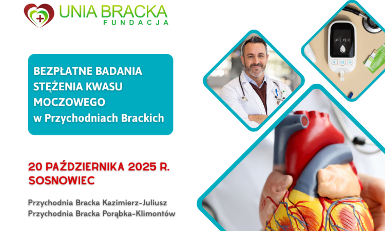 Zapraszamy 20 października do Przychodniach Brackich w Sosnowcu na bezpłatne badania stężenia kwasu moczowego. Z okazji Światowego Dnia Reumatyzmu Fundacja “Unia Bracka” włącza się w kampanię “Obniżamy kwas moczowy” i niezależnie od tego czy jesteście pacjentami Przychodni Brackich możecie w tym dniu wykonać to badanie bezpłatnie.