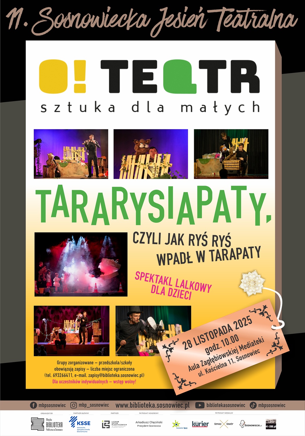 28 listopada o godz. 10.00 w Auli Zagłębiowskiej Mediateki odbędzie się spektakl lalkowy dla dzieci w wykonaniu Grupy O!TEATR „Tararysiapaty, czyli jak ryś Ryś wpadł w tarapaty”. Impreza jest częścią programu 11. Sosnowieckiej Jesieni Teatralnej. Grupy zorganizowane – przedszkola/szkoły – obowiązują zapisy – liczba miejsc ograniczona (tel. 693266411, e-mail. zapisy@biblioteka.sosnowiec.pl). Dla uczestników indywidualnych – wstęp wolny!