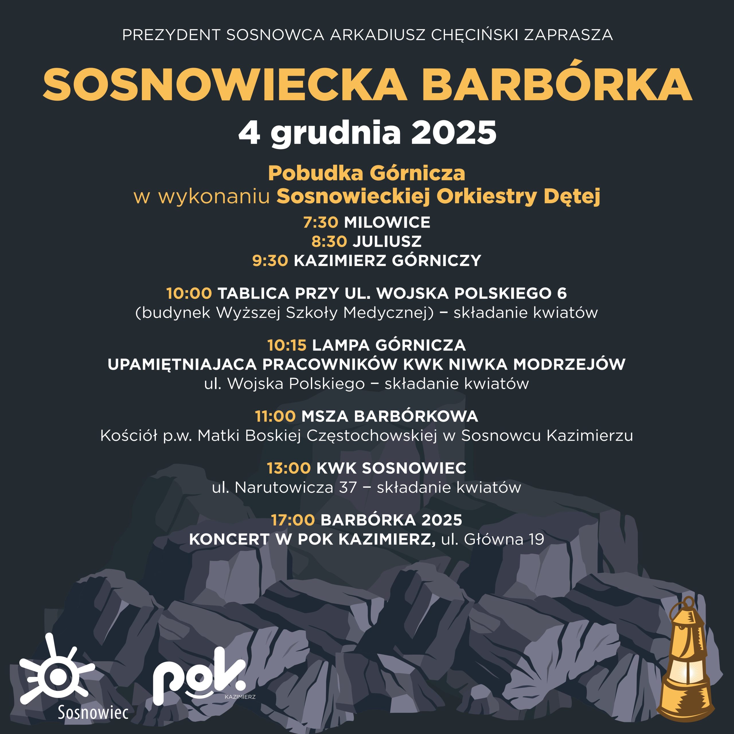 – W Sosnowcu przemysł górniczy to już historia, ale wśród mieszkańców naszego miasta wciąż nie brakuje czynnych i byłych górników, a także członków ich rodzin. Z okazji nadchodzącej Barbórki składam w imieniu władz miasta najlepsze życzenia pomyślności, zdrowia i szczęścia. Sosnowiec nie zapomina o swoich górniczych tradycjach i wy też nie zapominajcie o barbórkowych obchodach w kręgach rodziny i znajomych – mówi prezydent Sosnowca Arkadiusz Chęciński.