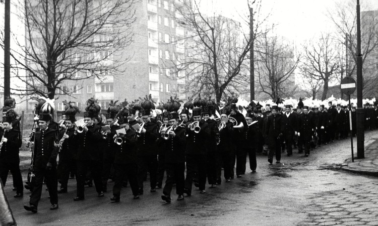 Zdjęcie przedstawia orkiestrę górniczą oraz pracowników kopalni „Sosnowiec”. Zostało zrobione w 1976 roku na ulicy Szkolnej.