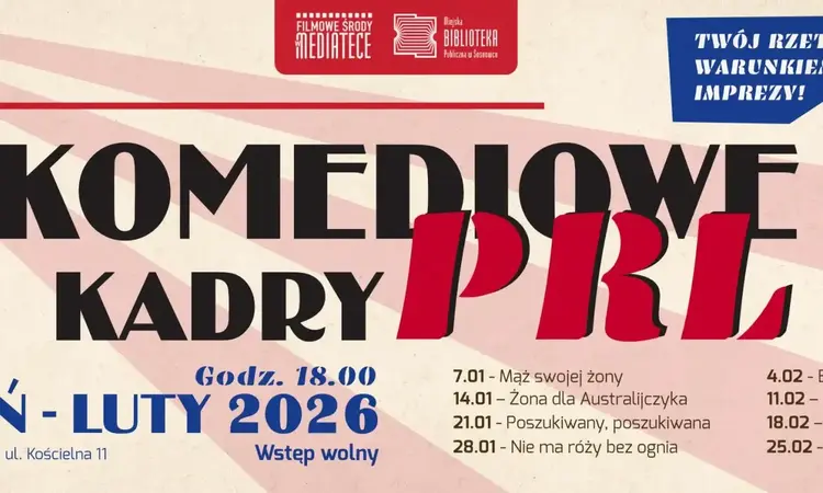 Styczniowe i lutowe wieczory, tym razem wypełnią nam kultowe komedie z czasów PRL. Na ekranie królować będą gwiazdy kina takie jak: Elżbieta Czyżewska, Bożena Dykiel, Ewa Kasprzyk, Krzysztof Kowalewski, Wojciech Pokora, Mieczysław Czechowicz, Jerzy Stuhr, Olgierd Łukaszewicz, Wiesław Gołas, Jan Kobuszewski i inni. Wieczory pełne absurdów, kultowych cytatów i niezapomnianych scen, pozwolą widzom ponownie zanurzyć się w atmosferze epoki PRL. Będzie to także okazja, by na nowo odkryć filmy, które na trwałe weszły do kanonu polskiej kinematografii. Dodatkowo – podczas pierwszego seansu (7.01) odbędzie się konkurs na przebranie w stylu PRL, przygotowana zostanie również tematyczna foto-ścianka, a na finał przeglądu (27.02) planowane jest wyjątkowe spotkanie z gościem-niespodzianką! Wstęp wolny.