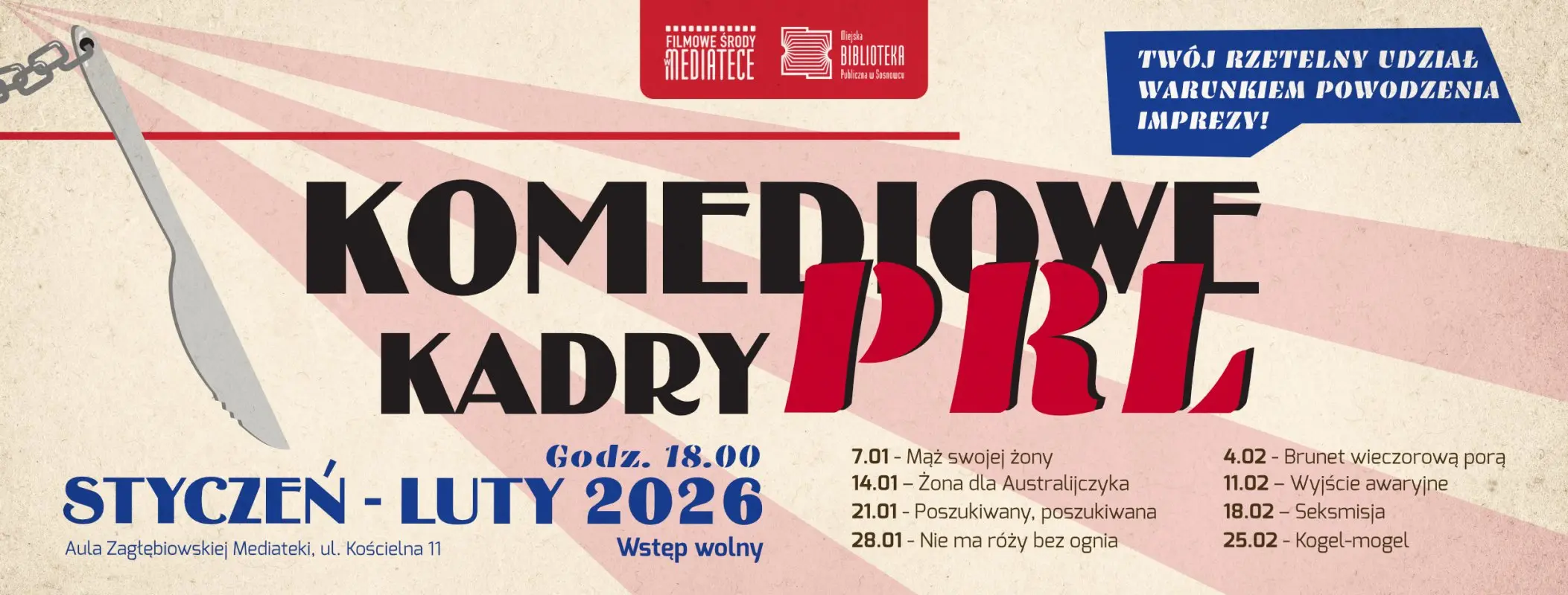 Seanse odbywać się będą o godz. 18.00 w Auli Zagłębiowskiej Mediateki przy ul. Kościelnej 11, we wszystkie środy stycznia i lutego: 7.01;14.01;21.01;28.01;4.02;11.02;18.02;25.02.2026. Przed każdym filmem, dr Magdalena Boczkowska przedstawi anegdoty i ciekawostki związane z poszczególnymi komediami, odsłaniając kulisy pracy reżyserów i wybranych aktorów/aktorek oraz absurdy tamtych czasów. Opowieściom towarzyszyć będą prezentacje multimedialne.