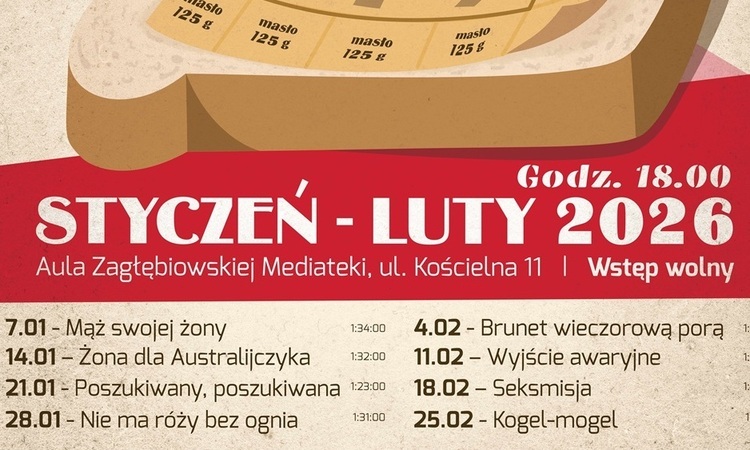 Seanse odbywać się będą o godz. 18.00 w Auli Zagłębiowskiej Mediateki przy ul. Kościelnej 11, we wszystkie środy stycznia i lutego: 7.01;14.01;21.01;28.01;4.02;11.02;18.02;25.02.2026.