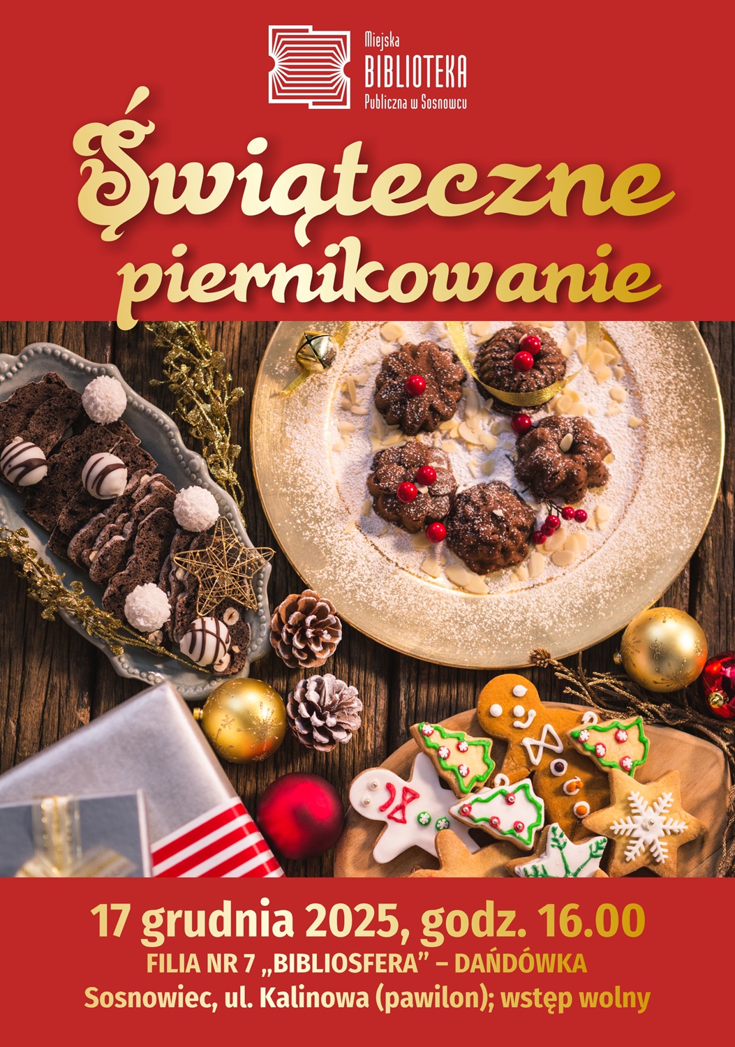 Tym razem cykliczne spotkanie czytelników zainteresowanych kreatywnym tworzeniem i wspólnym spędzaniem czasu wolnego będzie pachnące cynamonem i kardamonem. Do udziału w piernikowaniu zapraszamy także mieszkańców Osiedla Kalinowa, seniorów, dzieci i młodzież. Wydarzenie odbędzie się 17 grudnia 2025 o godz. 16.00, w siedzibie Biblioteki przy ul. Kalinowej (pawilon). Wstęp wolny.