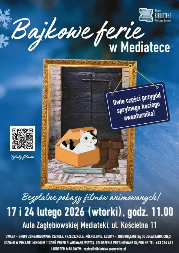17 i 24 lutego 2026 o godz. 11.00 Zagłębiowska Mediateka serdecznie zaprasza wszystkie dzieci wraz z opiekunami, na bezpłatne pokazy dwóch filmów animowanych o zawadiackim kocurze.Familijne seanse, zorganizowane w ramach ferii zimowych 2026, odbywać się będą w Auli Zagłębiowskiej Mediateki.