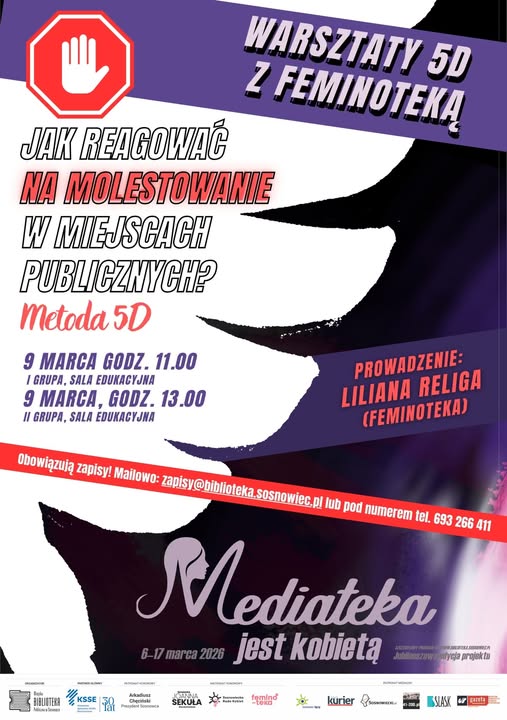W ramach tegorocznej edycji „Mediateka jest Kobietą” zapraszamy serdecznie na wyjątkowe warsztaty dla kobiet prowadzone przez trenerkę z Fundacja Feminoteka. Jak radzić sobie w sytuacji zagrożenia? Jak reagować na molestowanie? Czym jest metoda 5D? O tym i nie tylko o tym już 9 marca .