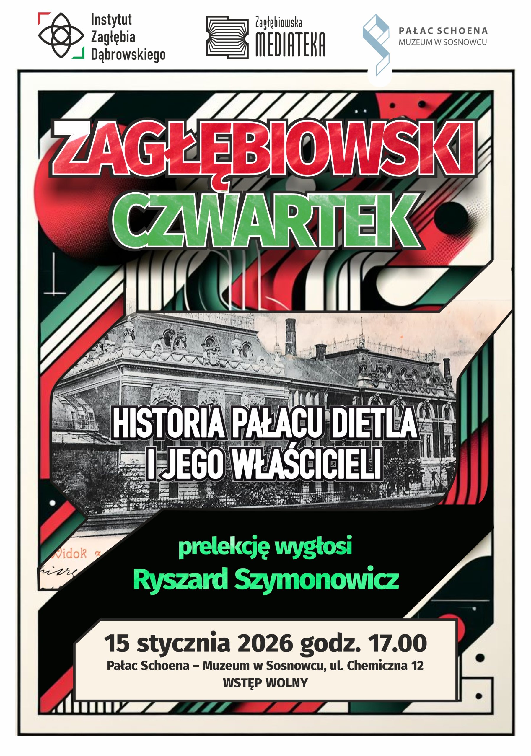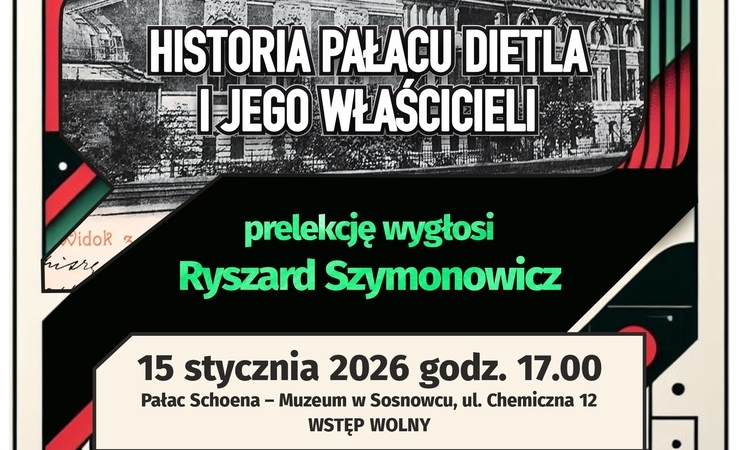Naszym gościem będzie Ryszard Szymonowicz – konserwator zabytków i administrator Pałacu, który zdradzi nie tylko tajemnice samego budynku, ale i przedstawi fascynujące dzieje rodziny Dietlów. Zapraszamy 15 stycznia 2026 na godz. 17.00 do Pałacu Schoena – Muzeum w Sosnowcu (ul. Chemiczna 12). Wstęp wolny!