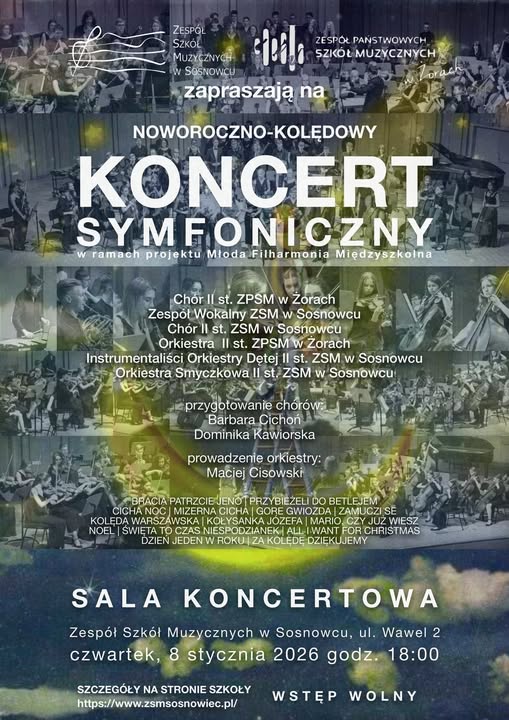 Zespół Szkół Muzycznych w Sosnowcu zaprasza 8 stycznia o godz.18.00 na Koncert Noworoczno-Kolędowy,w ramach projektu Młodej Filharmonii Międzyszkolnej.