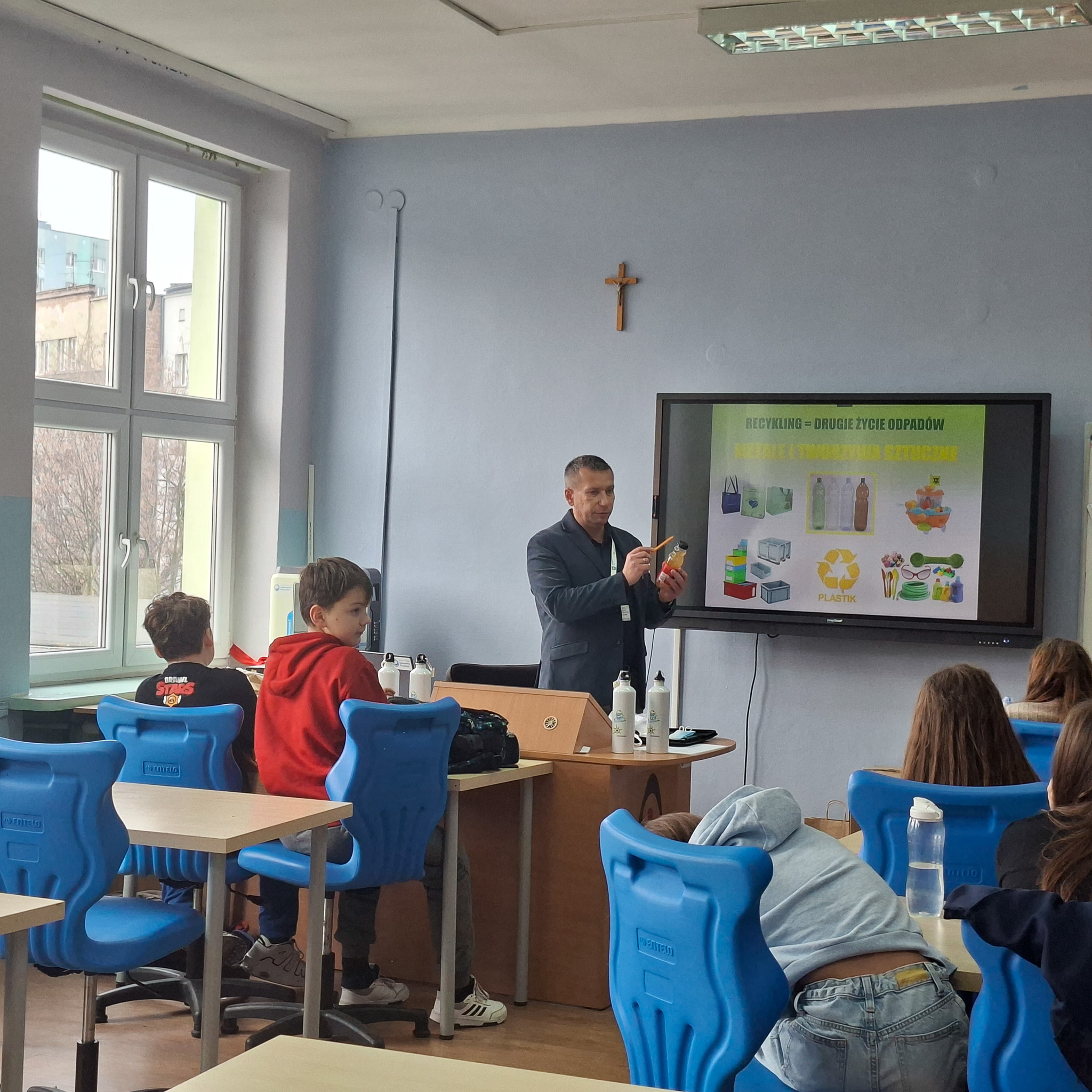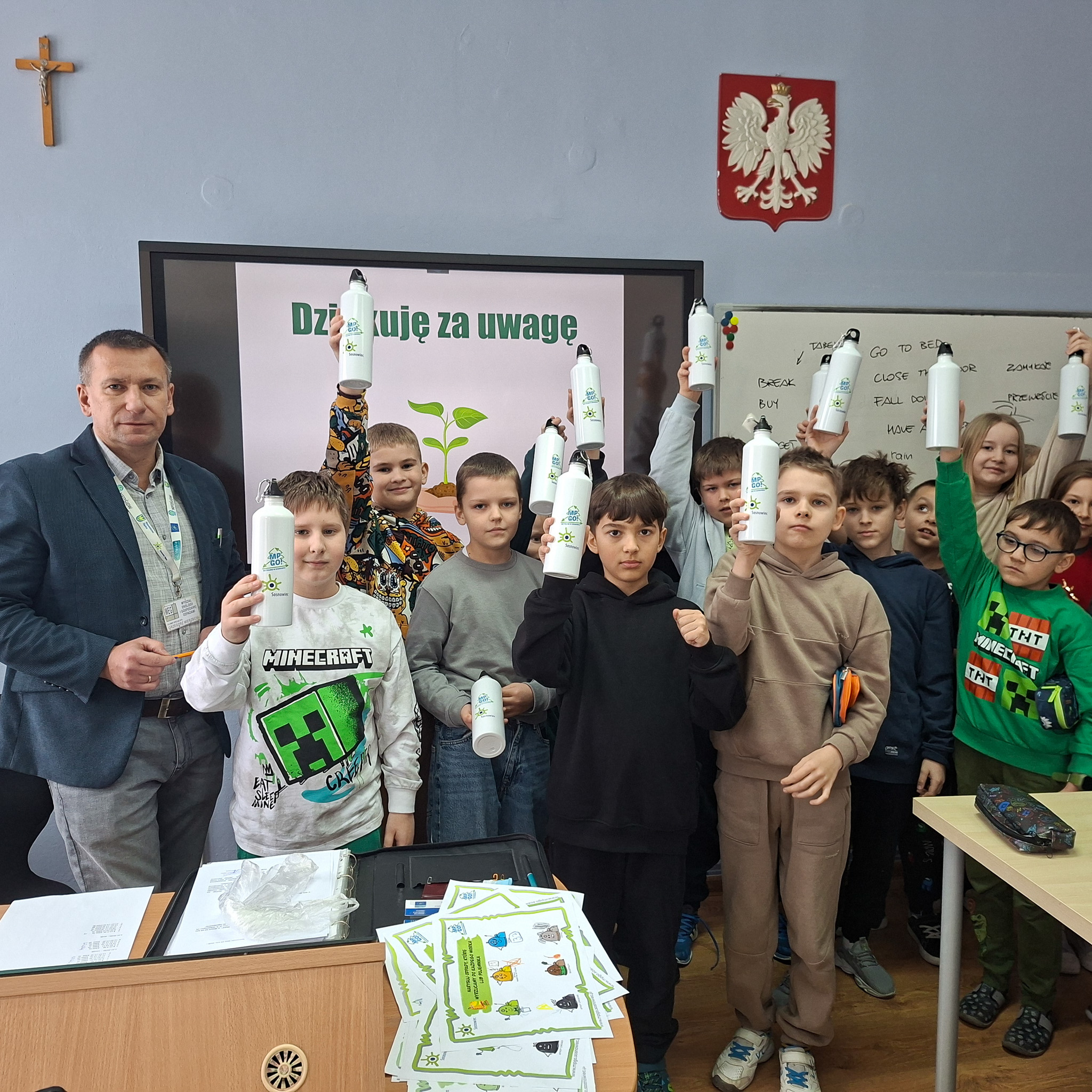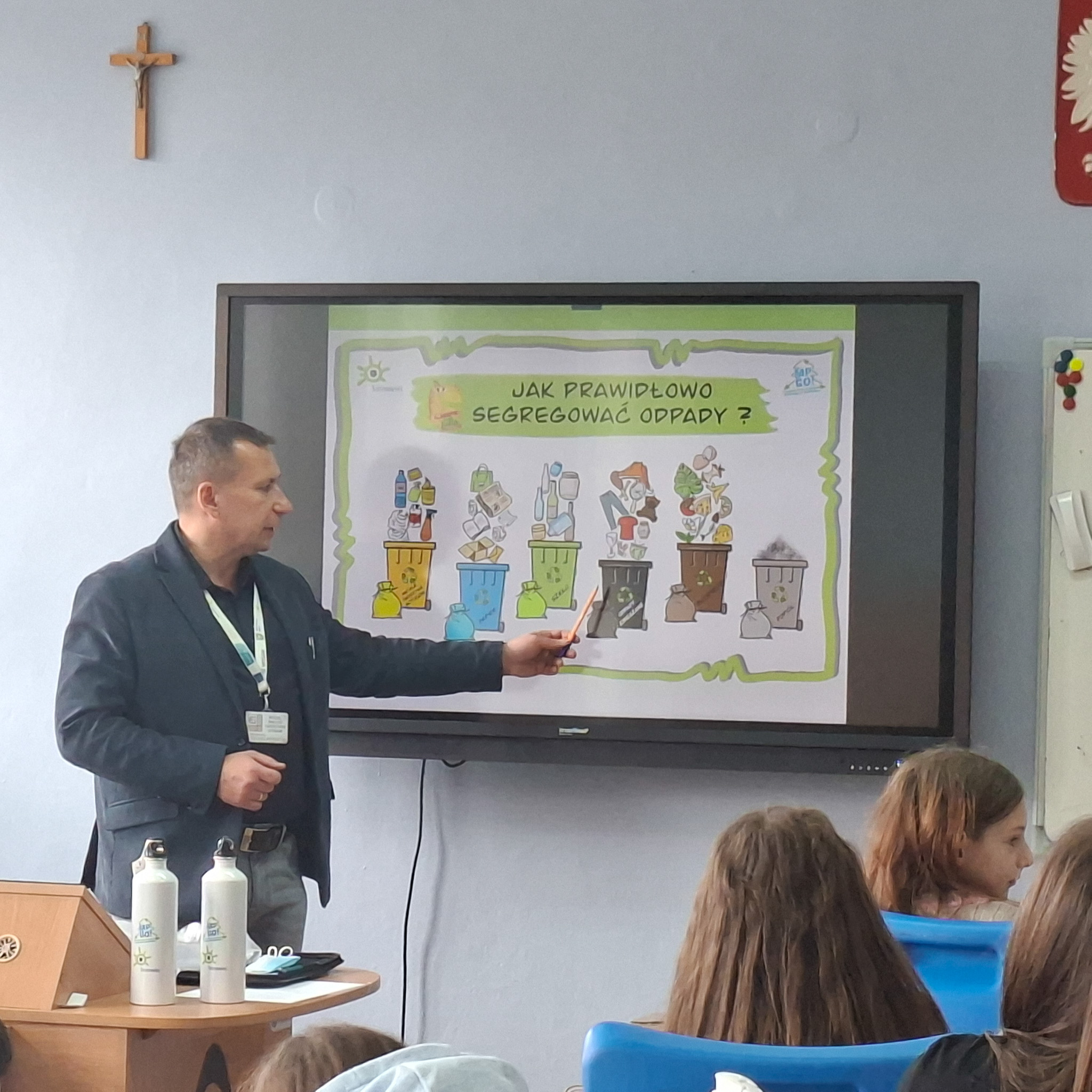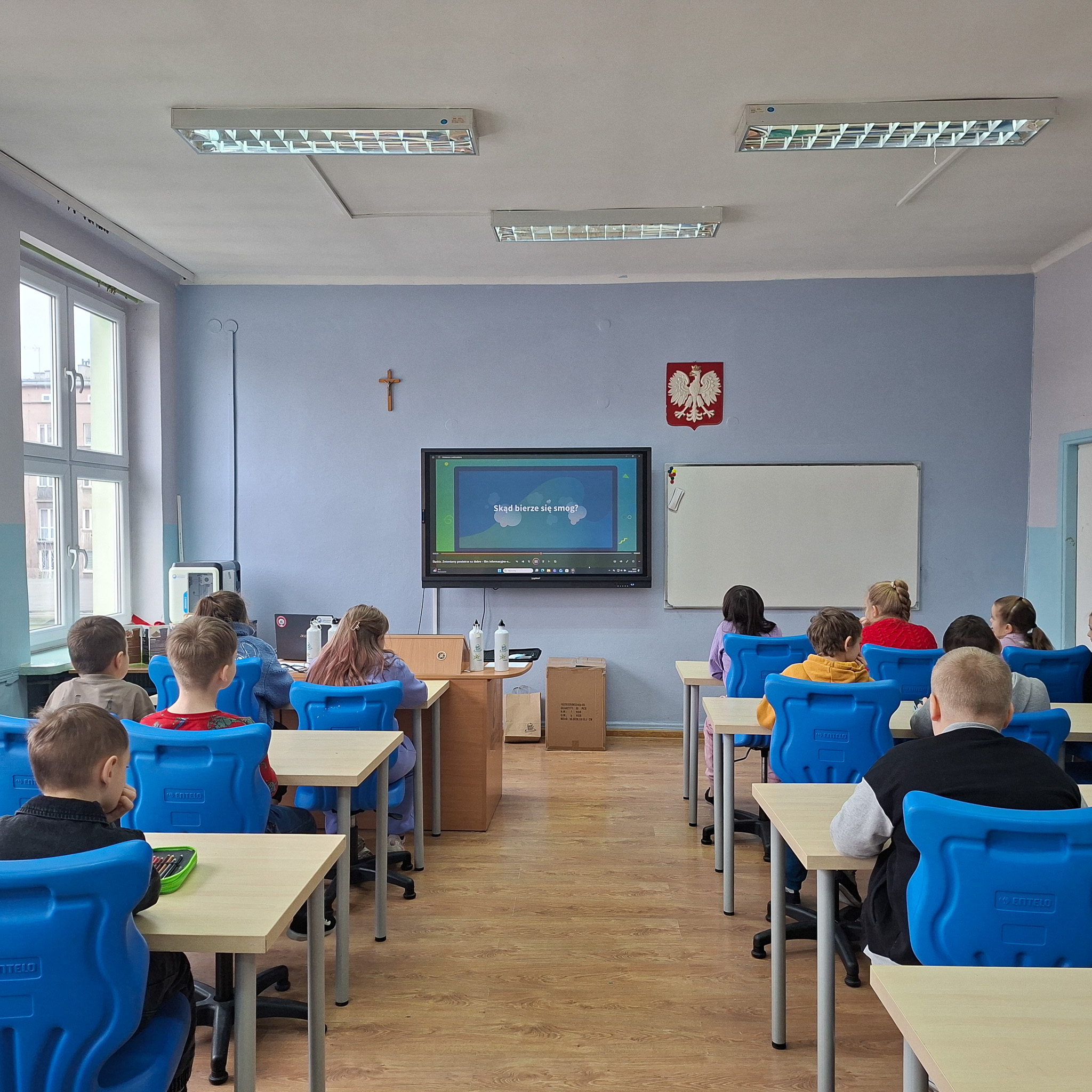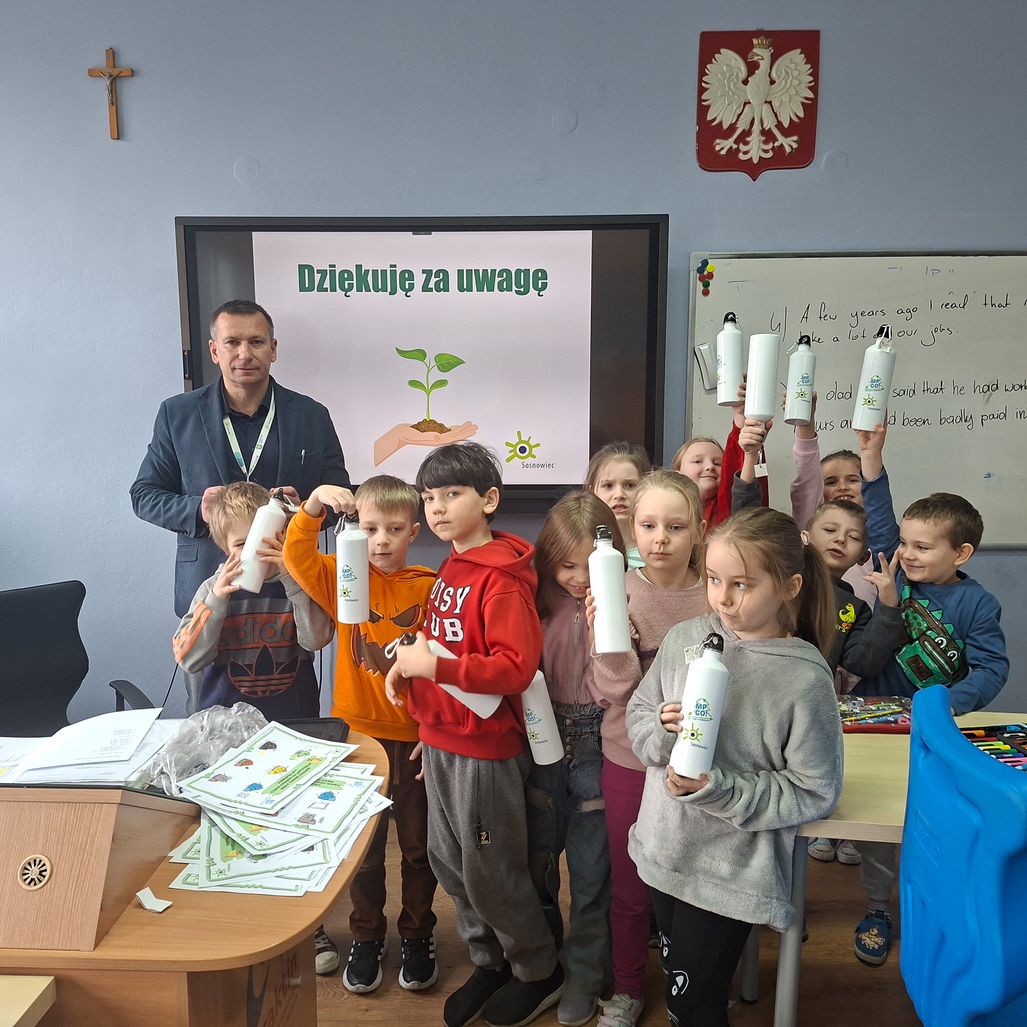 W dniach od 2 do 4 lutego 2026 r. Ekodoradca gościł w Szkole Podstawowej nr 22 w Sosnowcu przy ul. Anieli Urbanowicz 14, gdzie zostały prowadzone zajęcia w ramach realizowanego przez Urząd Miasta Sosnowca unijnego projektu LIFE „Śląskie. Przywracamy błękit”. W pierwszej kolejności młodzież szkolna została zapoznana z problematyką zanieczyszczeń powietrza, zwłaszcza że w ostatnim okresie podczas ujemnych temperatur na terenie naszego miasta była pogorszona jakość powietrza. Omówiono przyczyny powstawania SMOG-u, zagrożenia, jakie to zjawisko niesie dla życia i zdrowia ludzkiego, jak reagować, kiedy mamy podejrzenia, że ktoś spala odpady, gdzie sprawdzać jakość powietrza, aby nie przebywać zbyt długo na zewnątrz i nie wietrzyć pomieszczeń w przypadku wystąpienia alertu smogowego. Oprócz prezentacji wykorzystano też filmy edukacyjne ze strony Samorządu Województwa Śląskiego – „Śląskie pełne czystej energii”, które zostały opracowane w ramach kampanii edukacyjno-informacyjnej pt. „MOGĘ! Zatrzymać SMOG…”. Następnie młodzież szkolna została zapoznana z problematyką gospodarowania opadami. Pokazano jakie są zagrożenia środowiskowe, jeżeli nie będziemy prawidłowo segregować odpadów i poddawać ich recyklingowi. W tym celu wykorzystano prezentację przygotowaną przez MPGO Sosnowiec. Na koniec każdych zajęć uczniowie poszczególnych klas dostawali drobne bidony, a na terenie szkoły pozostawiono grę edukacyjną oraz informacje, jak można nawiązać kontakt z Ekodoradcą, w przypadku gdyby ktoś zauważył jakieś nieprawidłowości lub chciał skorzystać z porady dotyczącej wymiany nieefektywnego źródła ciepła, którego używanie jest niezgodne z obowiązującą tak zwaną „Śląską uchwałą antysmogową”. Łącznie w zajęcia brało udział 256 uczniów z klas I-VIII, którzy aktywnie brali udział w zajęciach, wykazując się przy tym podstawową wiedzą na temat współczesnej ekologii.