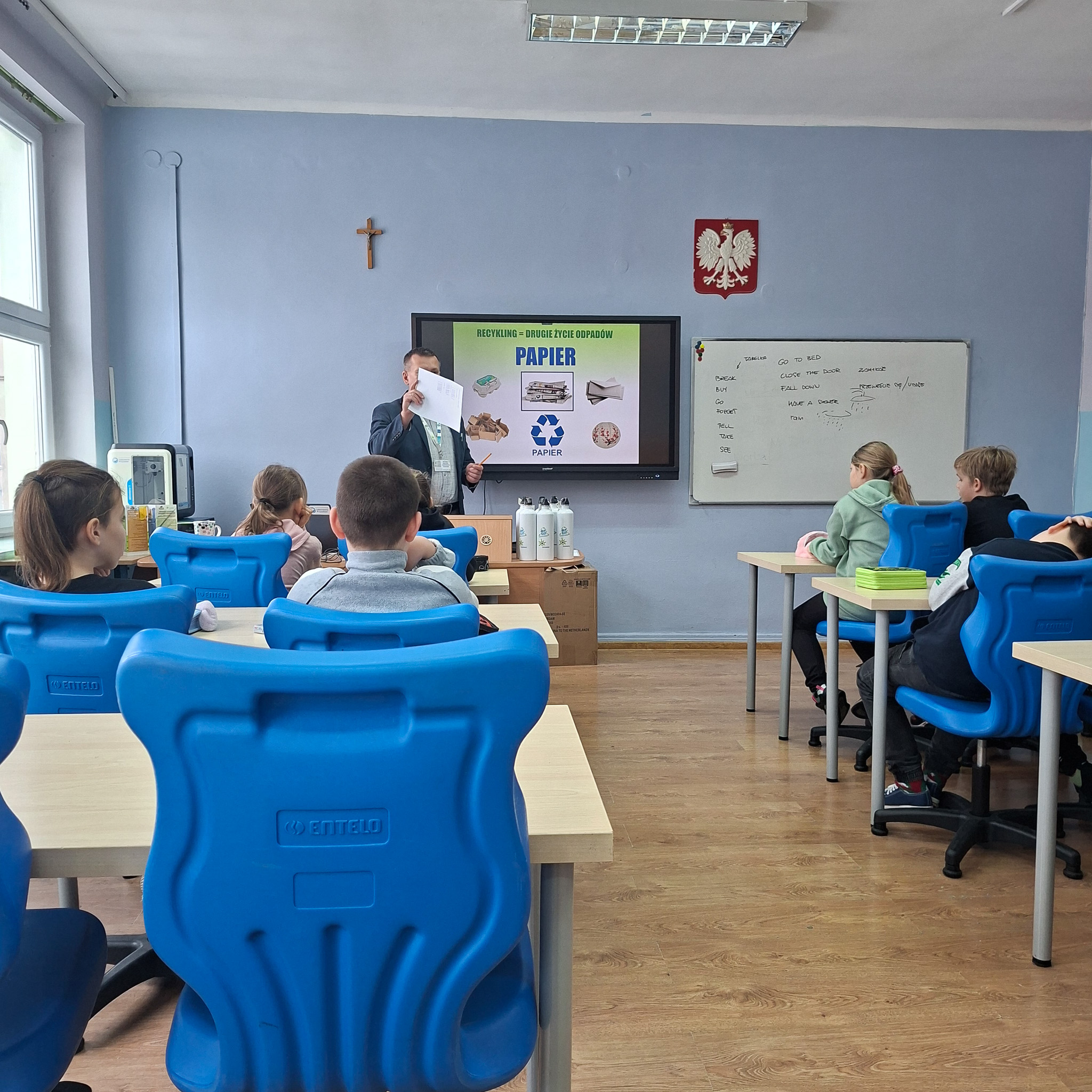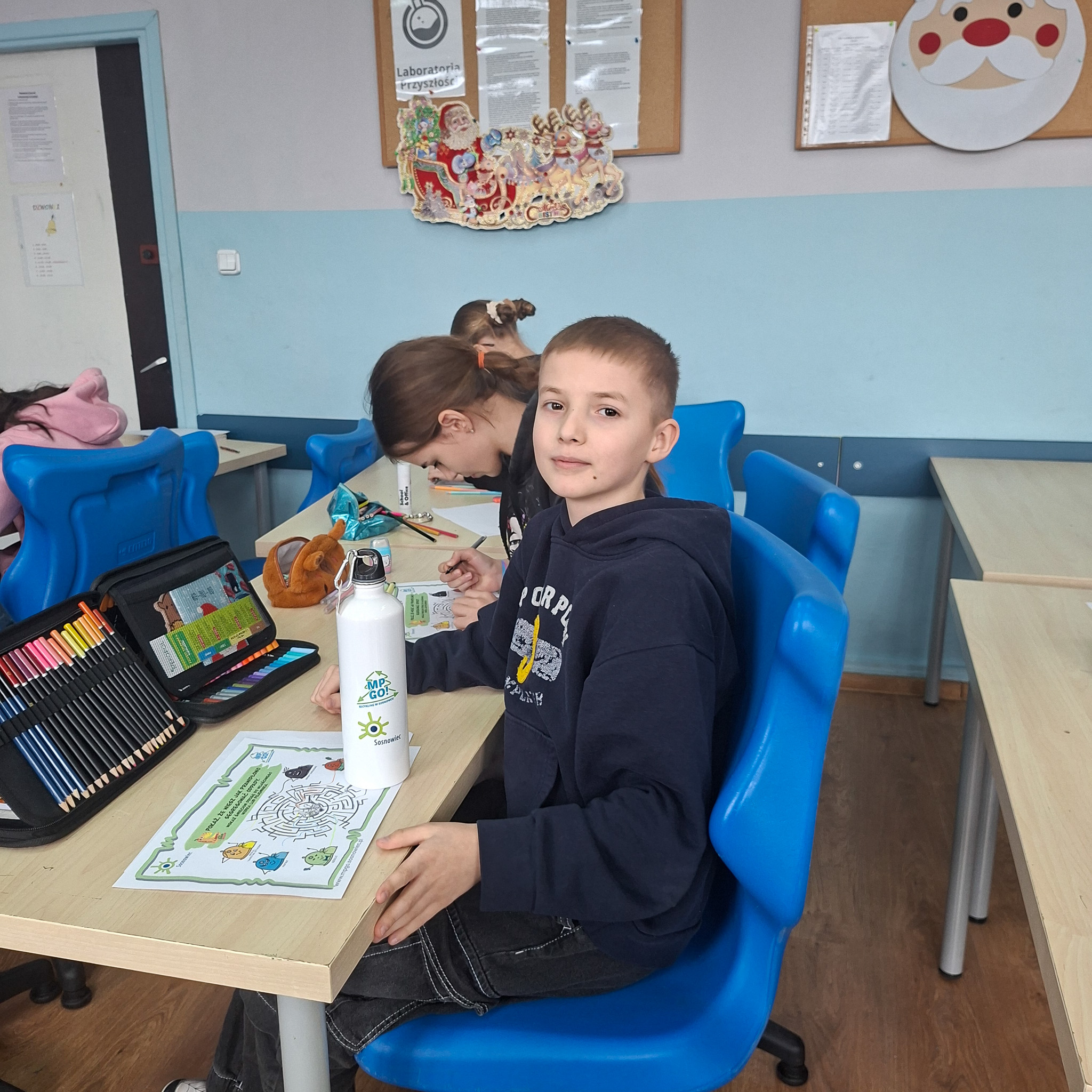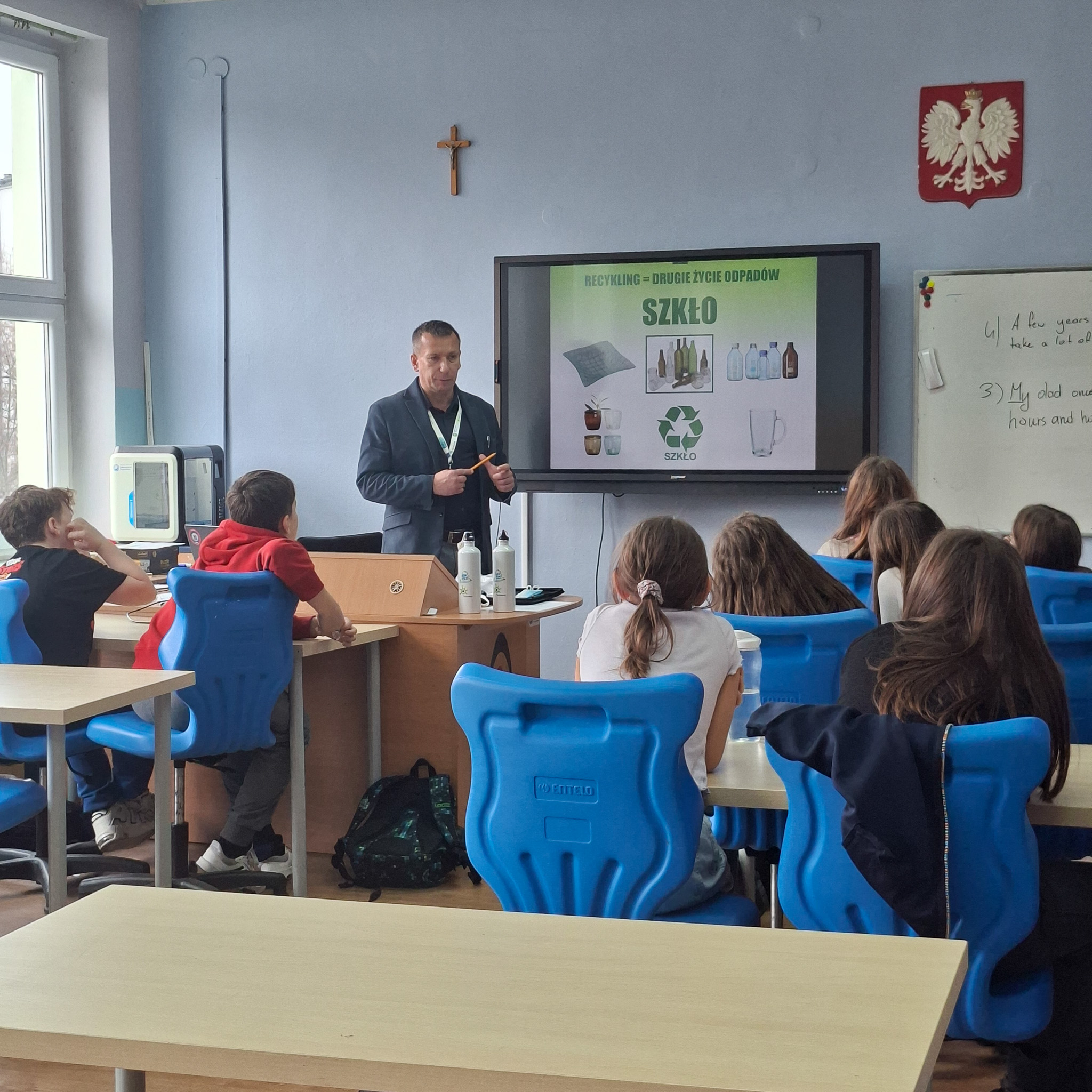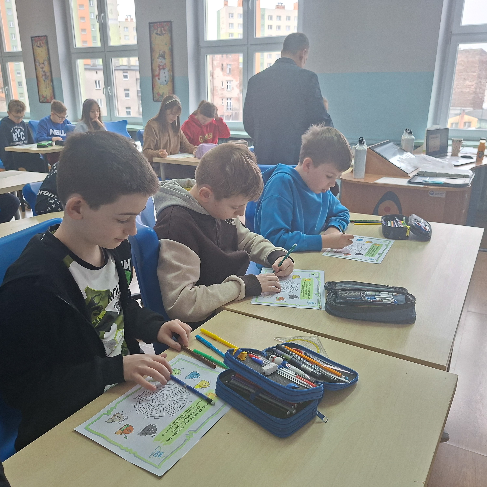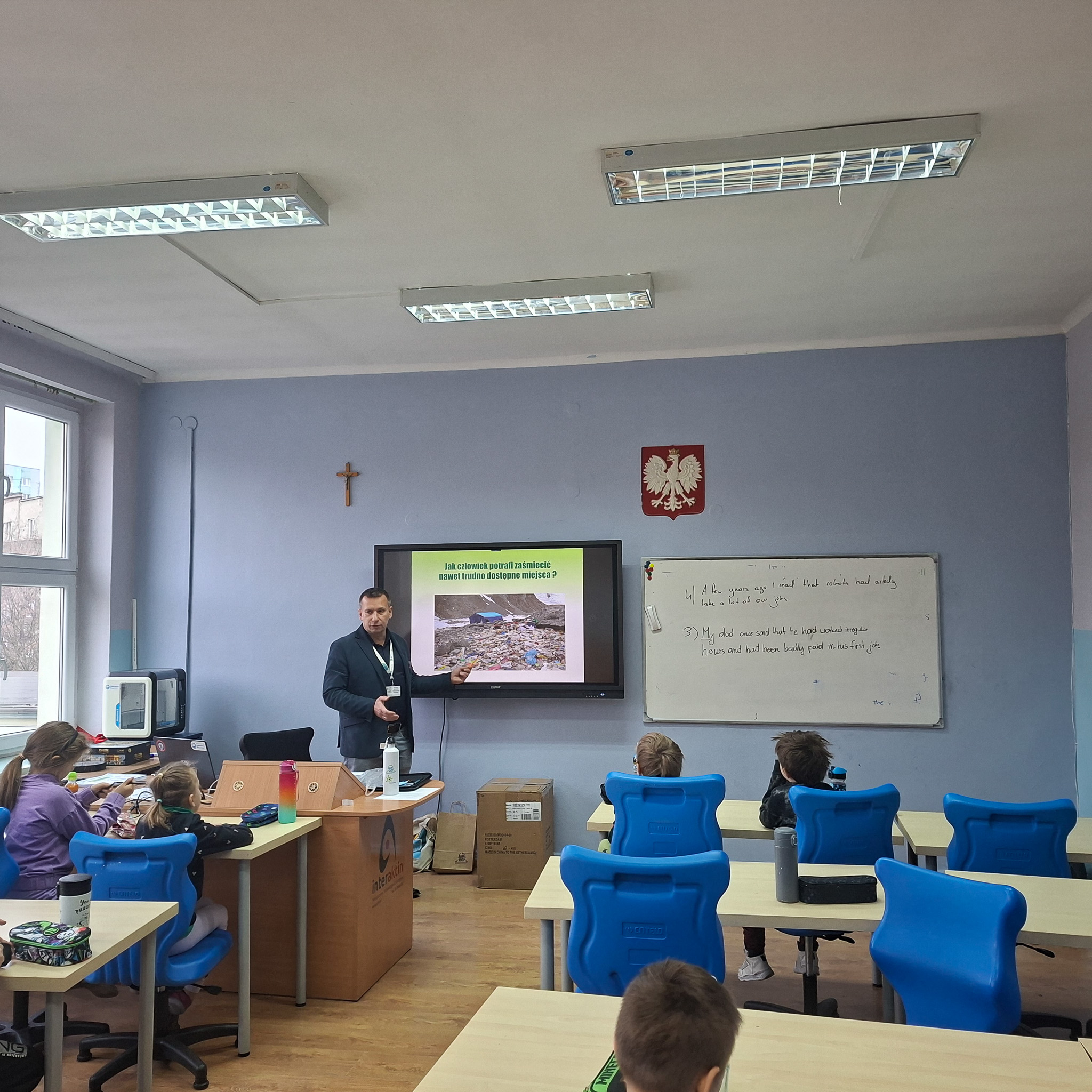 W dniach od 2 do 4 lutego 2026 r. Ekodoradca gościł w Szkole Podstawowej nr 22 w Sosnowcu przy ul. Anieli Urbanowicz 14, gdzie zostały prowadzone zajęcia w ramach realizowanego przez Urząd Miasta Sosnowca unijnego projektu LIFE „Śląskie. Przywracamy błękit”. W pierwszej kolejności młodzież szkolna została zapoznana z problematyką zanieczyszczeń powietrza, zwłaszcza że w ostatnim okresie podczas ujemnych temperatur na terenie naszego miasta była pogorszona jakość powietrza. Omówiono przyczyny powstawania SMOG-u, zagrożenia, jakie to zjawisko niesie dla życia i zdrowia ludzkiego, jak reagować, kiedy mamy podejrzenia, że ktoś spala odpady, gdzie sprawdzać jakość powietrza, aby nie przebywać zbyt długo na zewnątrz i nie wietrzyć pomieszczeń w przypadku wystąpienia alertu smogowego. Oprócz prezentacji wykorzystano też filmy edukacyjne ze strony Samorządu Województwa Śląskiego – „Śląskie pełne czystej energii”, które zostały opracowane w ramach kampanii edukacyjno-informacyjnej pt. „MOGĘ! Zatrzymać SMOG…”. Następnie młodzież szkolna została zapoznana z problematyką gospodarowania opadami. Pokazano jakie są zagrożenia środowiskowe, jeżeli nie będziemy prawidłowo segregować odpadów i poddawać ich recyklingowi. W tym celu wykorzystano prezentację przygotowaną przez MPGO Sosnowiec. Na koniec każdych zajęć uczniowie poszczególnych klas dostawali drobne bidony, a na terenie szkoły pozostawiono grę edukacyjną oraz informacje, jak można nawiązać kontakt z Ekodoradcą, w przypadku gdyby ktoś zauważył jakieś nieprawidłowości lub chciał skorzystać z porady dotyczącej wymiany nieefektywnego źródła ciepła, którego używanie jest niezgodne z obowiązującą tak zwaną „Śląską uchwałą antysmogową”. Łącznie w zajęcia brało udział 256 uczniów z klas I-VIII, którzy aktywnie brali udział w zajęciach, wykazując się przy tym podstawową wiedzą na temat współczesnej ekologii.