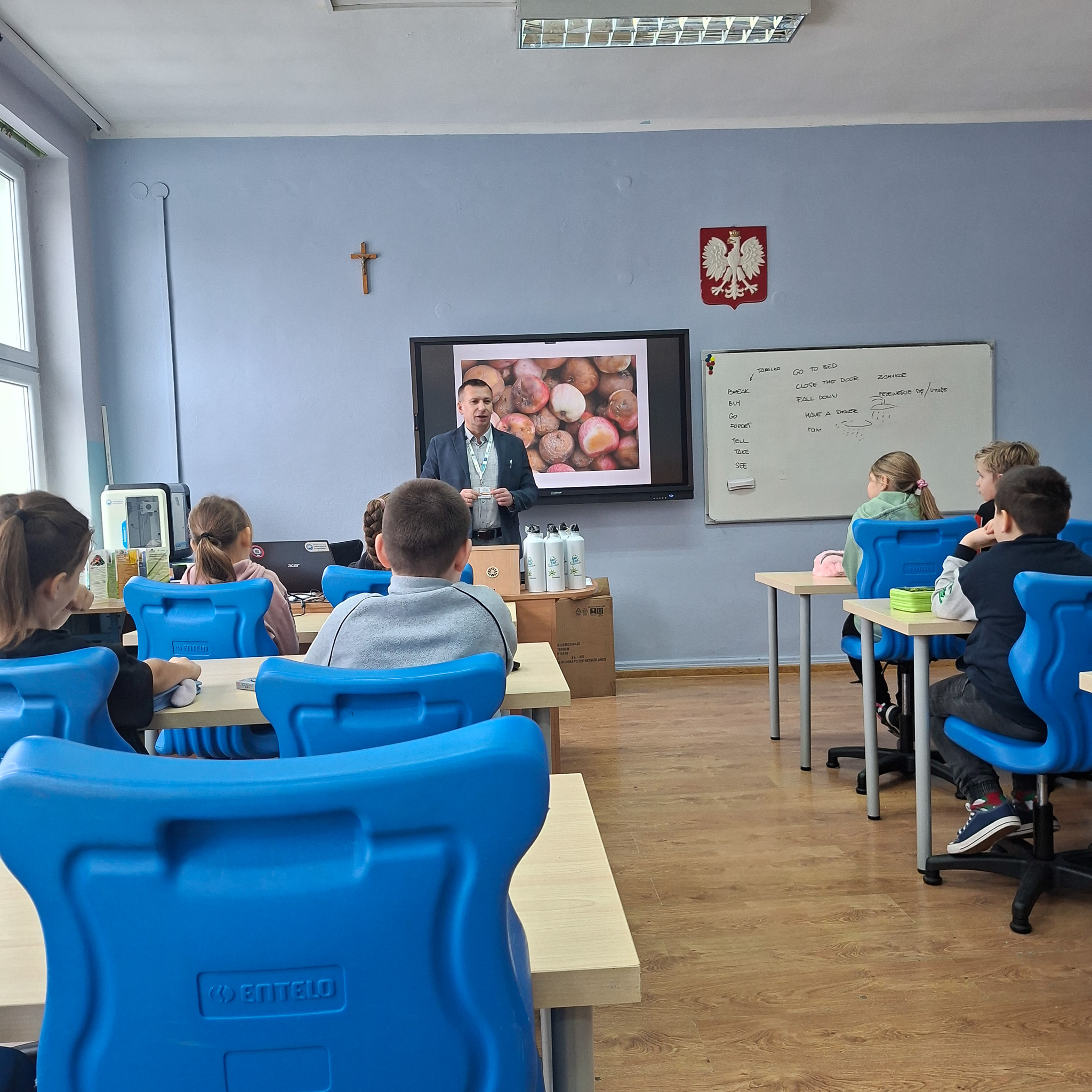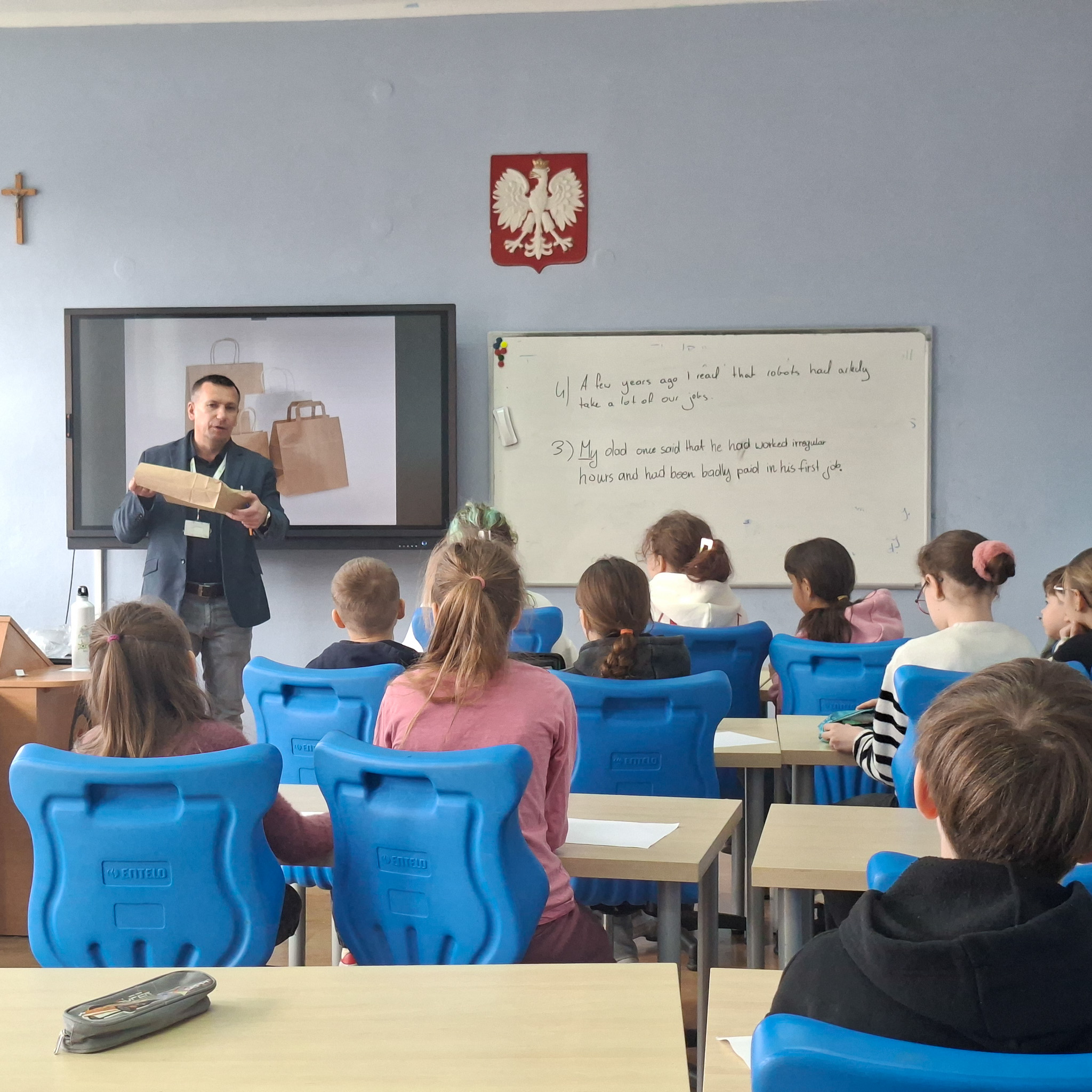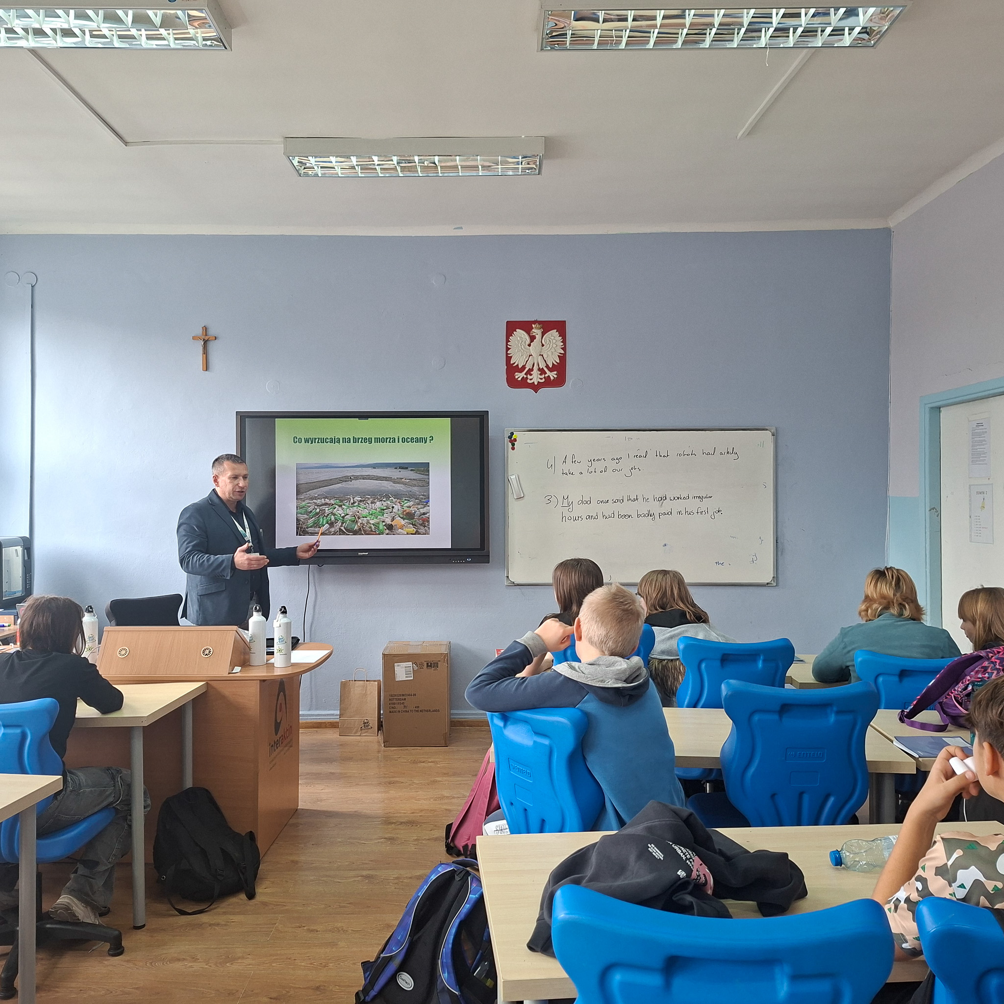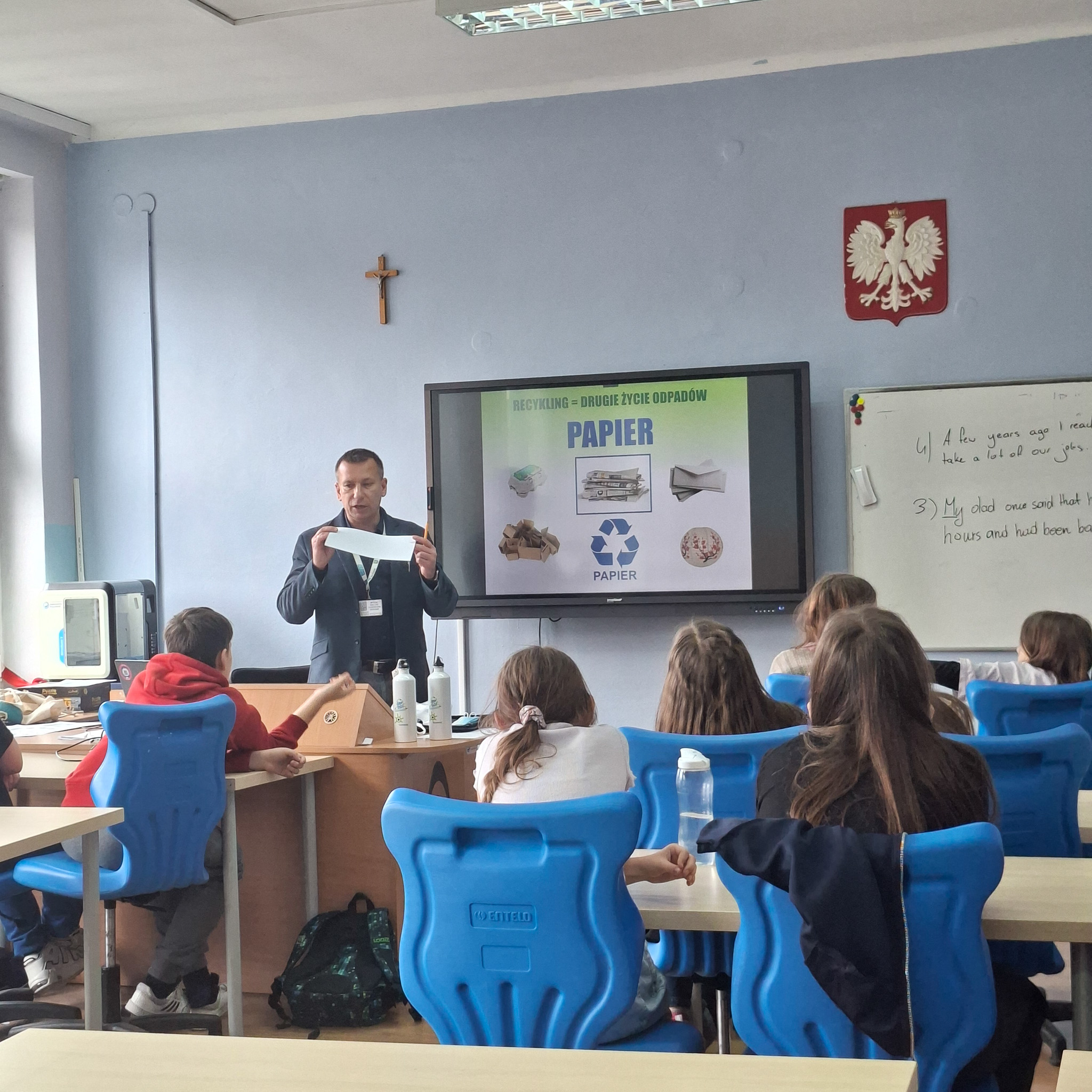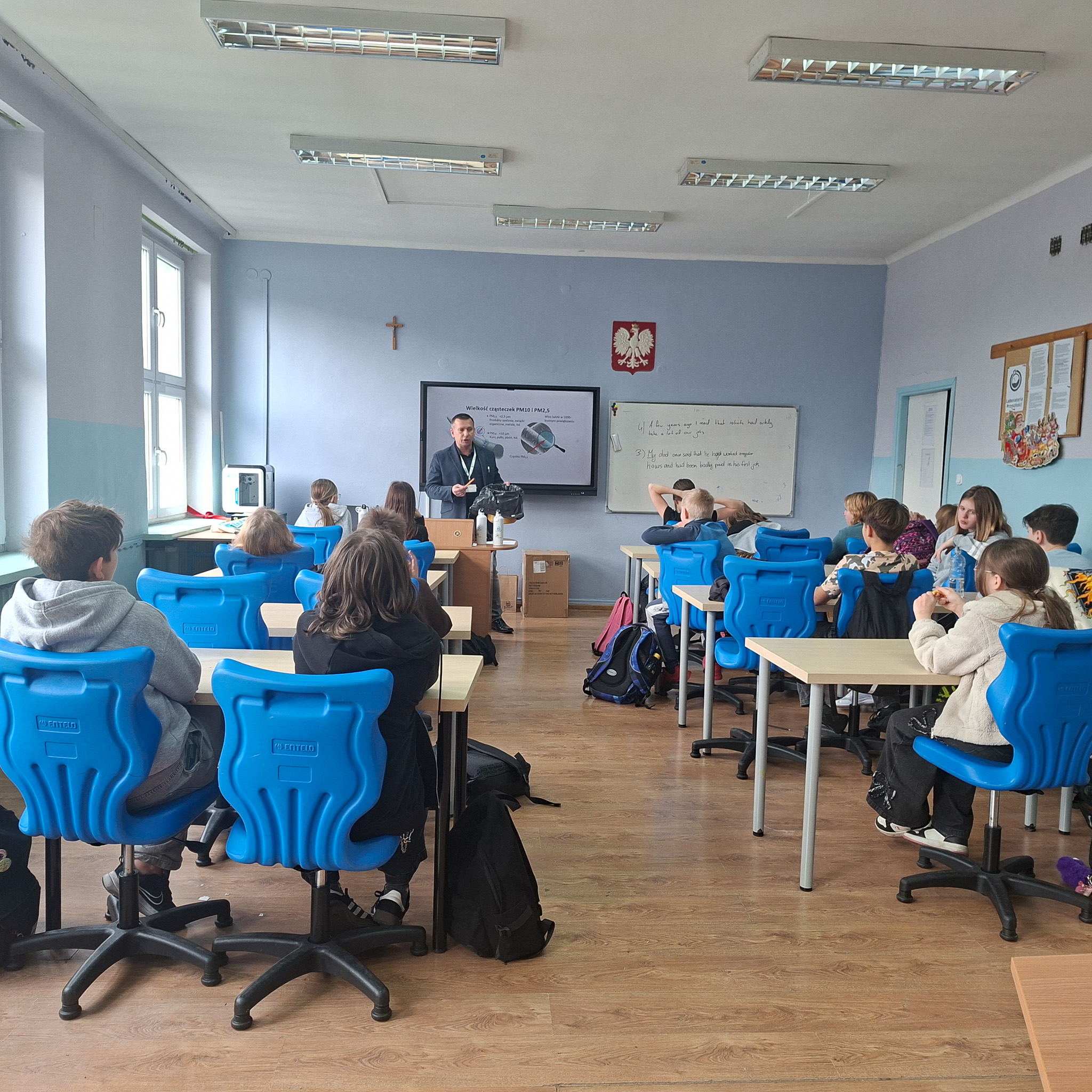 W dniach od 2 do 4 lutego 2026 r. Ekodoradca gościł w Szkole Podstawowej nr 22 w Sosnowcu przy ul. Anieli Urbanowicz 14, gdzie zostały prowadzone zajęcia w ramach realizowanego przez Urząd Miasta Sosnowca unijnego projektu LIFE „Śląskie. Przywracamy błękit”. W pierwszej kolejności młodzież szkolna została zapoznana z problematyką zanieczyszczeń powietrza, zwłaszcza że w ostatnim okresie podczas ujemnych temperatur na terenie naszego miasta była pogorszona jakość powietrza. Omówiono przyczyny powstawania SMOG-u, zagrożenia, jakie to zjawisko niesie dla życia i zdrowia ludzkiego, jak reagować, kiedy mamy podejrzenia, że ktoś spala odpady, gdzie sprawdzać jakość powietrza, aby nie przebywać zbyt długo na zewnątrz i nie wietrzyć pomieszczeń w przypadku wystąpienia alertu smogowego. Oprócz prezentacji wykorzystano też filmy edukacyjne ze strony Samorządu Województwa Śląskiego – „Śląskie pełne czystej energii”, które zostały opracowane w ramach kampanii edukacyjno-informacyjnej pt. „MOGĘ! Zatrzymać SMOG…”. Następnie młodzież szkolna została zapoznana z problematyką gospodarowania opadami. Pokazano jakie są zagrożenia środowiskowe, jeżeli nie będziemy prawidłowo segregować odpadów i poddawać ich recyklingowi. W tym celu wykorzystano prezentację przygotowaną przez MPGO Sosnowiec. Na koniec każdych zajęć uczniowie poszczególnych klas dostawali drobne bidony, a na terenie szkoły pozostawiono grę edukacyjną oraz informacje, jak można nawiązać kontakt z Ekodoradcą, w przypadku gdyby ktoś zauważył jakieś nieprawidłowości lub chciał skorzystać z porady dotyczącej wymiany nieefektywnego źródła ciepła, którego używanie jest niezgodne z obowiązującą tak zwaną „Śląską uchwałą antysmogową”. Łącznie w zajęcia brało udział 256 uczniów z klas I-VIII, którzy aktywnie brali udział w zajęciach, wykazując się przy tym podstawową wiedzą na temat współczesnej ekologii.