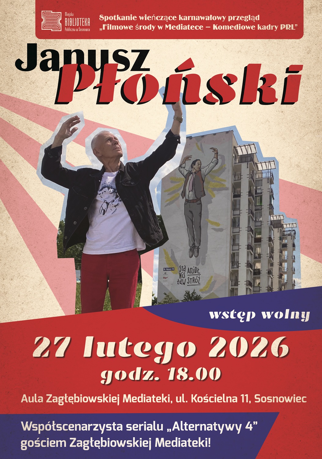 Spotkanie będzie symbolicznym zakończeniem karnawałowego przeglądu „Filmowe środy w Mediatece – Komediowe kadry PRL” – organizowanego w styczniu i lutym 2026 przez Miejską Bibliotekę Publiczną w Sosnowcu.