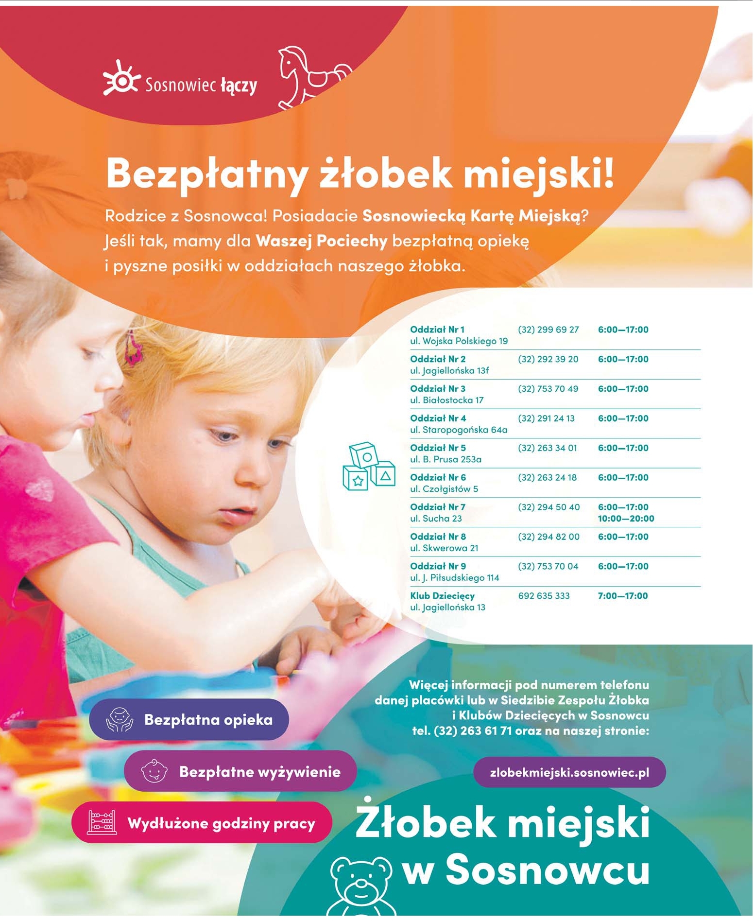 Zgodnie z uchwałą podjętą przez Radę Miejską w Sosnowcu rodzice dzieci uczęszczających do Zespołu Żłobka i Klubów Dziecięcych mają możliwość zwolnienia z ponoszenia opłaty za wyżywienie dziecka. Warunkiem jest złożenie wniosku oraz okazanie przez rodziców ważnej karty programu „Sosnowiecka Karta Miejska”. Wówczas przy korzystaniu ze świadczenia „Aktywnie w żłobku” pobyt dziecka w sosnowieckim żłobku jest całkowicie bezpłatny. Warto pa mię tać, że w oddziale żłobka nr 7 przy ul. Suchej 23 wydłużono godziny świadczenia opieki nad dziećmi do godziny 20.00. Oddział żłobka świad czy opiekę nad dziećmi na za sa dzie dwuzmianowości – od poniedział ku do piątku w go dzinach 6.00 do 17.00 oraz 10.00 do 20.00.