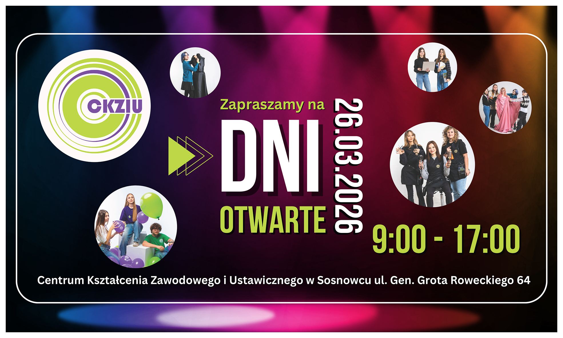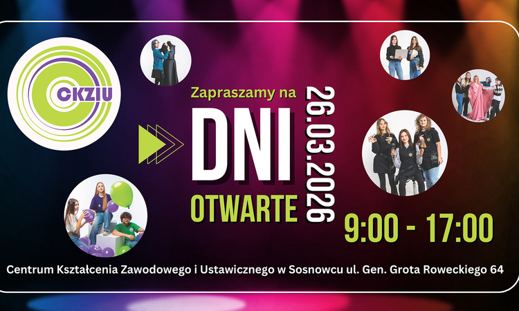 Dyrekcja, Nauczyciele oraz Uczniowie Centrum Kształcenia Zawodowego i Ustawicznego w Sosnowcu ul. Grota Roweckiego 64, mają zaszczyt zaprosić uczniów klas ósmych wraz z nauczycielami do udziału w Dniu Otwartym, który odbędzie się 26 marca 2026 roku.