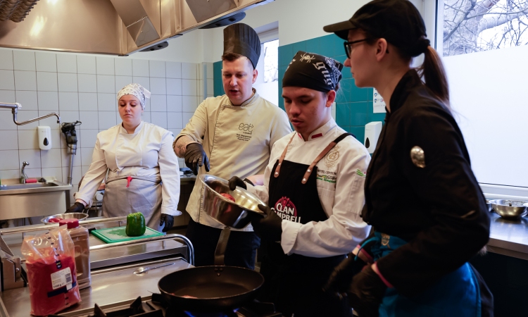 Uczniowie zapoznali się w praktyce z zaawansowaną wiedzą i umiejętnościami oraz z pewną filozofią gotowania i związanymi z tym wartościami. – Młodzież uczestniczyła bardzo aktywnie w dzisiejszych warsztatach. Poza pracą nad tradycyjnymi przepisami, testowaliśmy triki gastronomiczne i dużo rozmawialiśmy o pasji do gotowania. Zależało mi na tym, żeby pokazać jak różnorodne może być menu – że można ograniczyć użycie mięsa – albo poprzez ograniczenie jego ilości albo poprzez zamianę na strączki czy inne warzywa. Tworzyliśmy zrównoważone