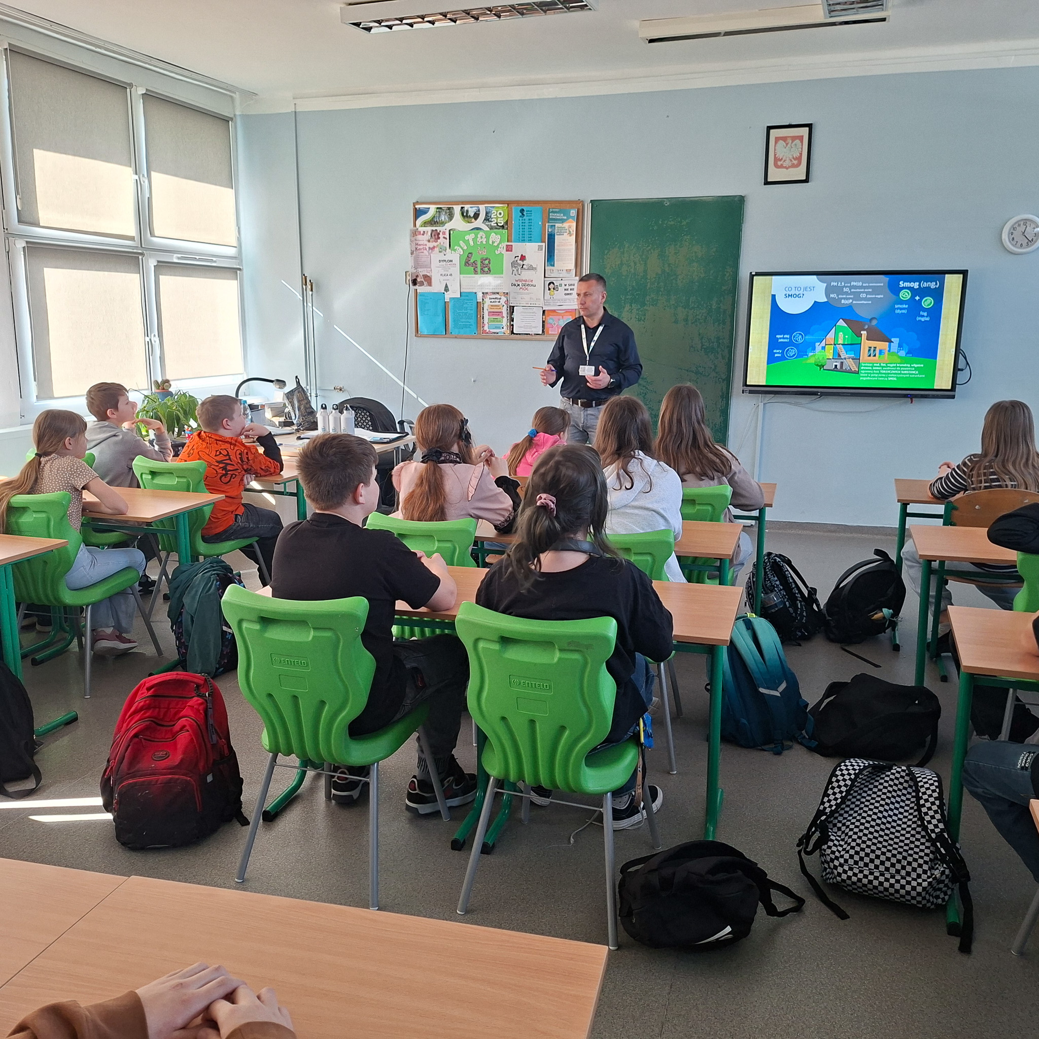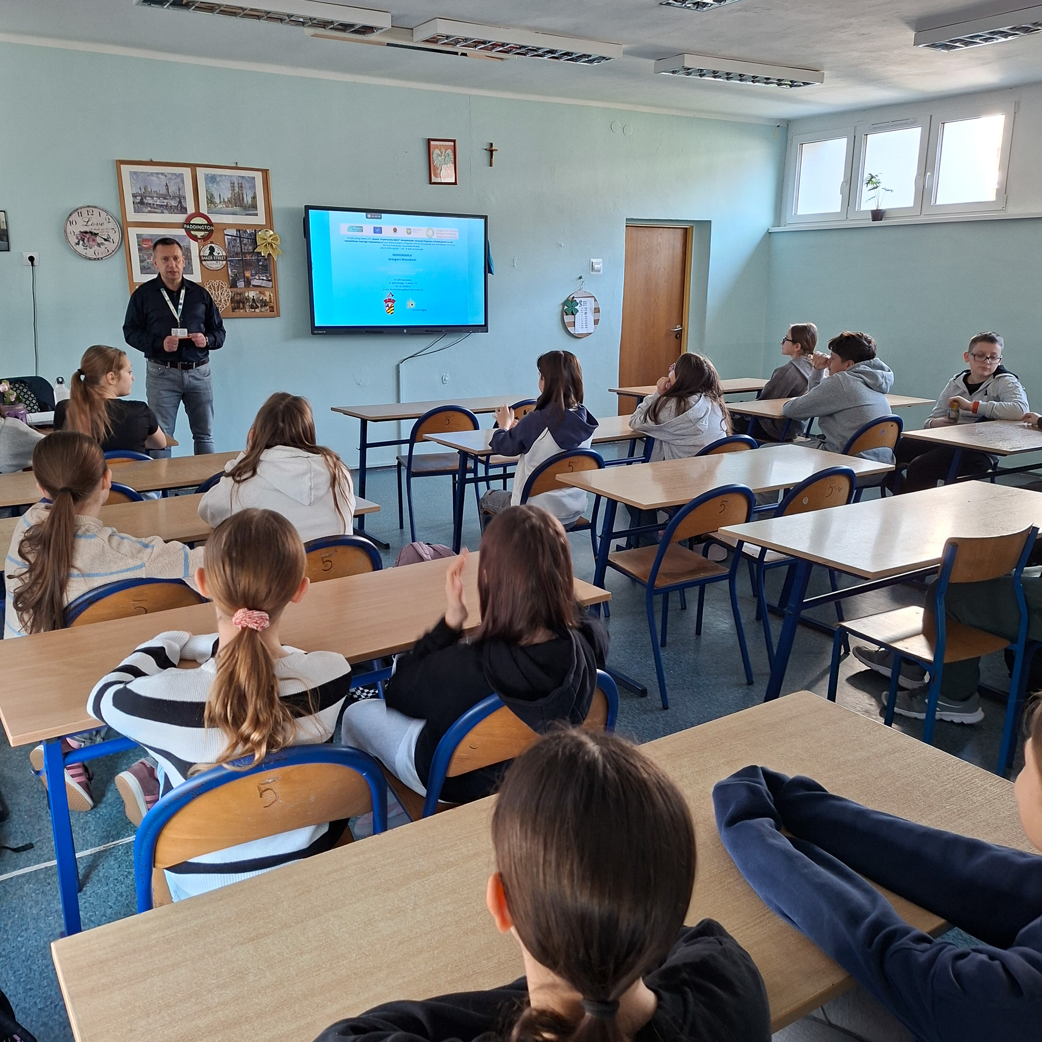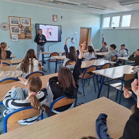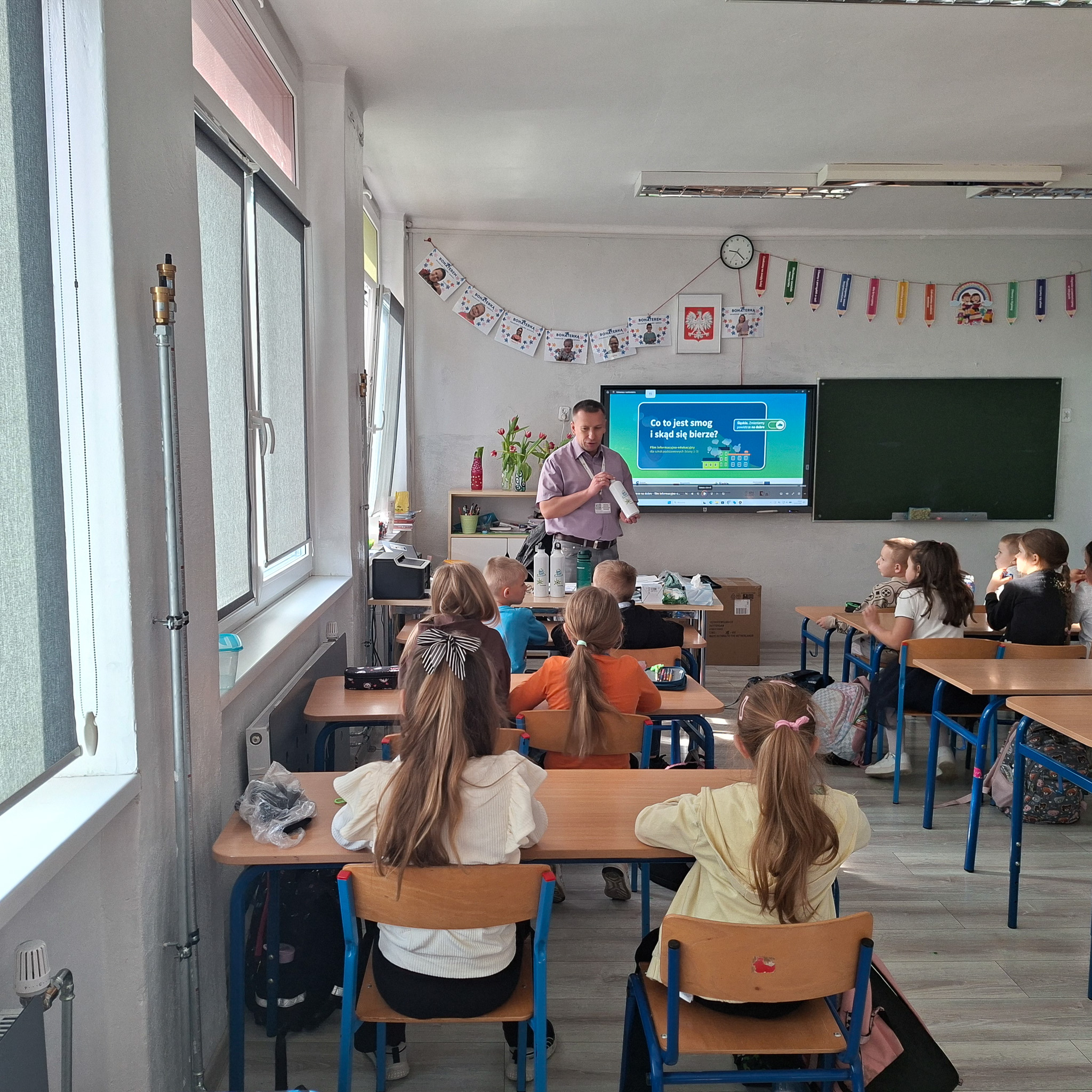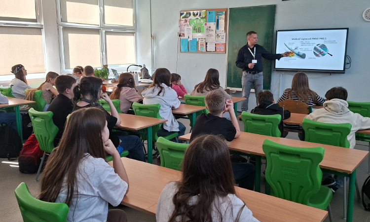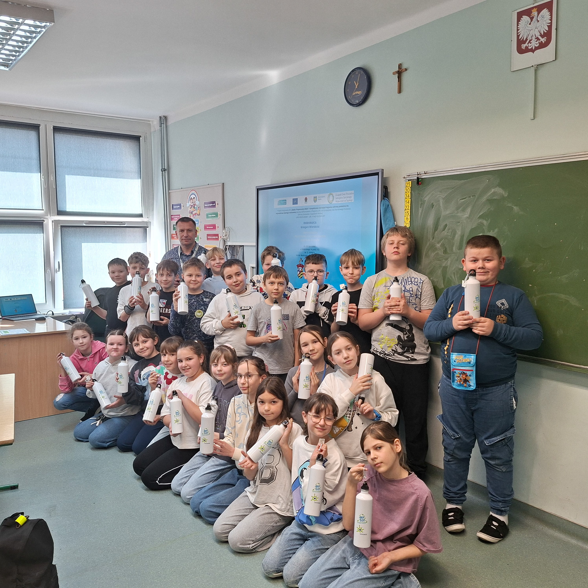 Mrozy już za nami, a na zewnątrz coraz cieplej. Nie oznacza to, że możemy już zapominać o niskich temperaturach, ponieważ wciąż mamy kalendarzową zimę, a co za tym idzie, w dalszym ciągu istnieje ryzyko wystąpienia SMOGU zwłaszcza kiedy osoby, które posiadają tak zwane kopciuchy dogrzewają się używając do tego węgla gorszej jakości lub co gorsza odpadów. Stąd w dniach od 09 do 12 marca 2026 r, Ekodoradca odwiedził Szkołę Podstawową nr 23 przy ul. Władysława Jagiełły 3, w rejonie której w ostatnim czasie było kilka zgłoszonych interwencji dotyczących zanieczyszczeń powietrza. Ekodoradca przeprowadził prelekcje dla uczniów tamtejszej szkoły w ramach projektu unijnego LIFE „Śląskie. Przywracamy błękit”. Łącznie w tych zajęciach, w klasach od I do VIII, wzięło udział 316 uczniów. W trakcie prelekcji uczniowie zostali zapoznani z problematyką zjawiska SMOGU. Omówiono przyczyny powstawania zanieczyszczeń powietrza, jaki skutek te zanieczyszczenia mają na nasze życie i zdrowie oraz jak można przeciwdziałać temu zjawisku. Młodzież szkolną poinformowano również o możliwościach ubiegania się o dotację na wymianę starego pieca lub kotła, które to urządzenia grzewcze są głównymi źródłami SMOGU jako emitory zanieczyszczeń, w ramach tak zwanej niskiej emisji. Dodatkowo omówiono na podstawie prezentacji z MPGO Sosnowiec, jak powstają odpady, czym jest mikroplastik oraz jak prawidłowo segregować odpady, którym należy nadawać tak zwane „drugie życie”. We wszystkich klasach zajęcia cieszyły się sporym zainteresowaniem, a młodzież szkolna chętnie włączała się do dyskusji. Podziękowania należą się również gronu pedagogicznemu, dzięki któremu zajęcia przebiegały sprawnie i w miłej atmosferze. Na koniec każdy uczeń otrzymał drobny upominek w postaci aluminiowego bidonu z logo Sosnowca i MPGO Sosnowiec.