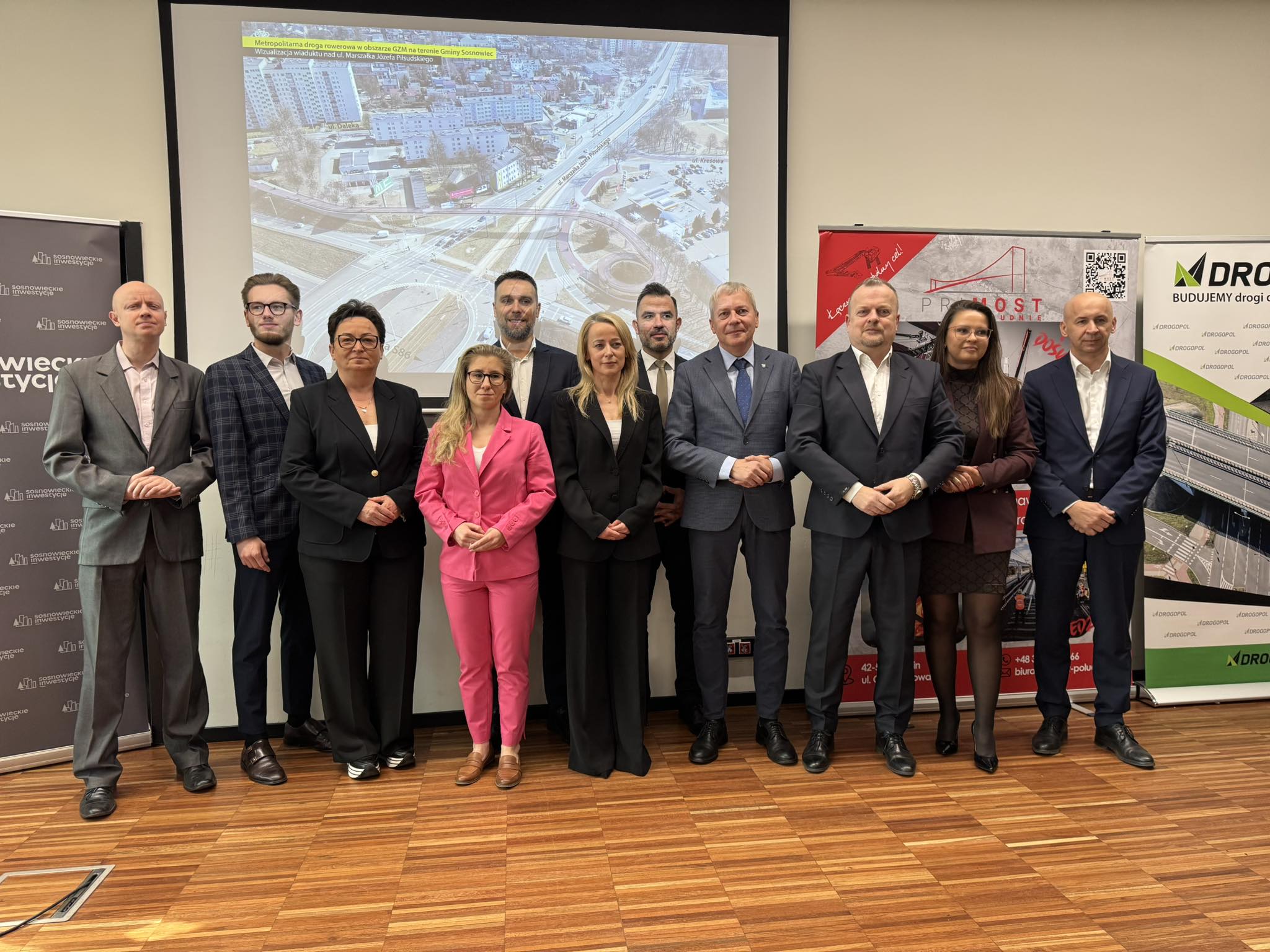 Na zdjęciu strojąco od lewej: Wojciech Nitwinko, Jakub Ćmachowski, Ewa Szota, Edyta Maj (radni Rady Miejskiej), Maciej Szczyrbowski (Drogopol), Anna Jedynak-Rykała (przewodnicząca Rady Miejskiej), Michał Tagoś (Primost Południe), Wojciech Saługa (marszałek województwa śląskiego), Arkadiusz Chęciński (prezydent Sosnowca), Kazimierz Karolczak (przewodniczący GZM), Małgorzata Delfin (prezes Sosnowieckich Inwestycji).