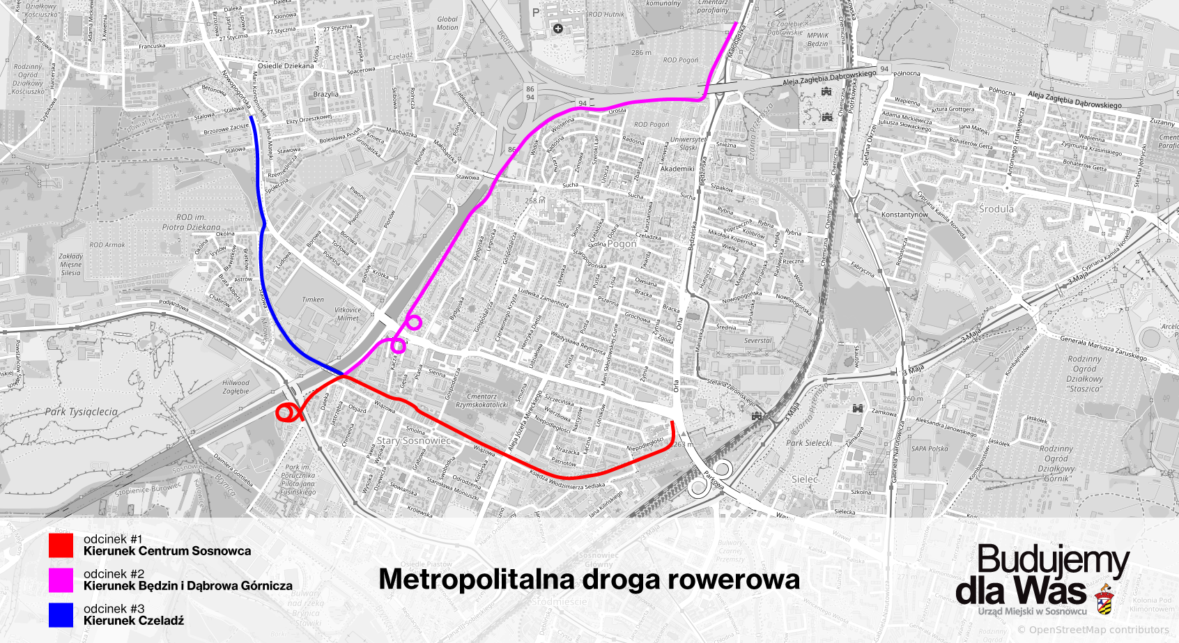 Droga rowerowa w kierunku Czeladzi będzie rozpoczynać się w rejonie ul. Wiązowej, gdzie skręcimy na dawny wiadukt kolejowy, który zostanie przebudowany. Następnie Velostrada zostanie poprowadzona wzdłuż ul. Stalowej i ul. Grota Roweckiego w kierunku granicy Czeladzi.