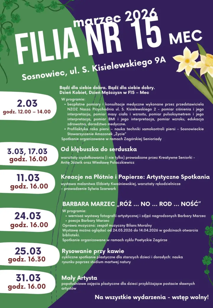 Marzec w Filii nr 15 – Mec Miejskiej Biblioteki Publicznej w Sosnowcu zapowiada się bardzo interesująco! Zachęcamy do zapoznania się ze szczegółami programu. Udział we wszystkich imprezach kulturalnych i warsztatach jest bezpłatny.