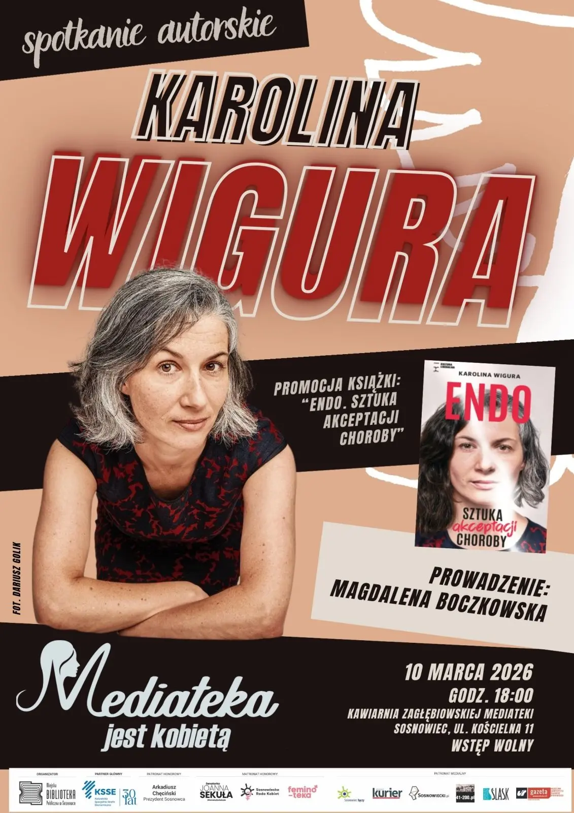 Miejska Biblioteka Publiczna w Sosnowcu – Organizator projektu „Mediateka jest Kobietą”, serdecznie zaprasza 10 marca na spotkanie autorskie z Karoliną Wigurą, dziennikarką, promujące niezwykle osobistą książkę Endo.