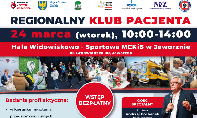 Regionalny Klub Pacjenta w Jaworznie zaprasza mieszkańców regionu do udziału w badaniach profilaktycznych, które odbędą się 24 marca 2026 r. w godzinach 10:00-14:00 w Hali Widowiskowo-Sportowej MCKiS w Jaworznie, ul. Grunwaldzka 80.