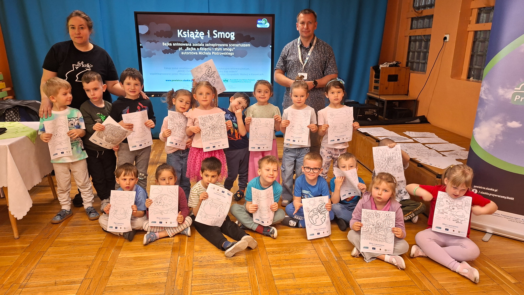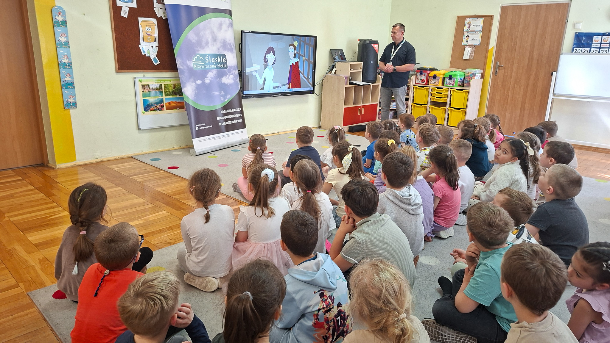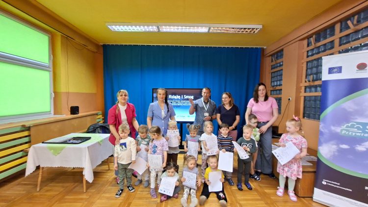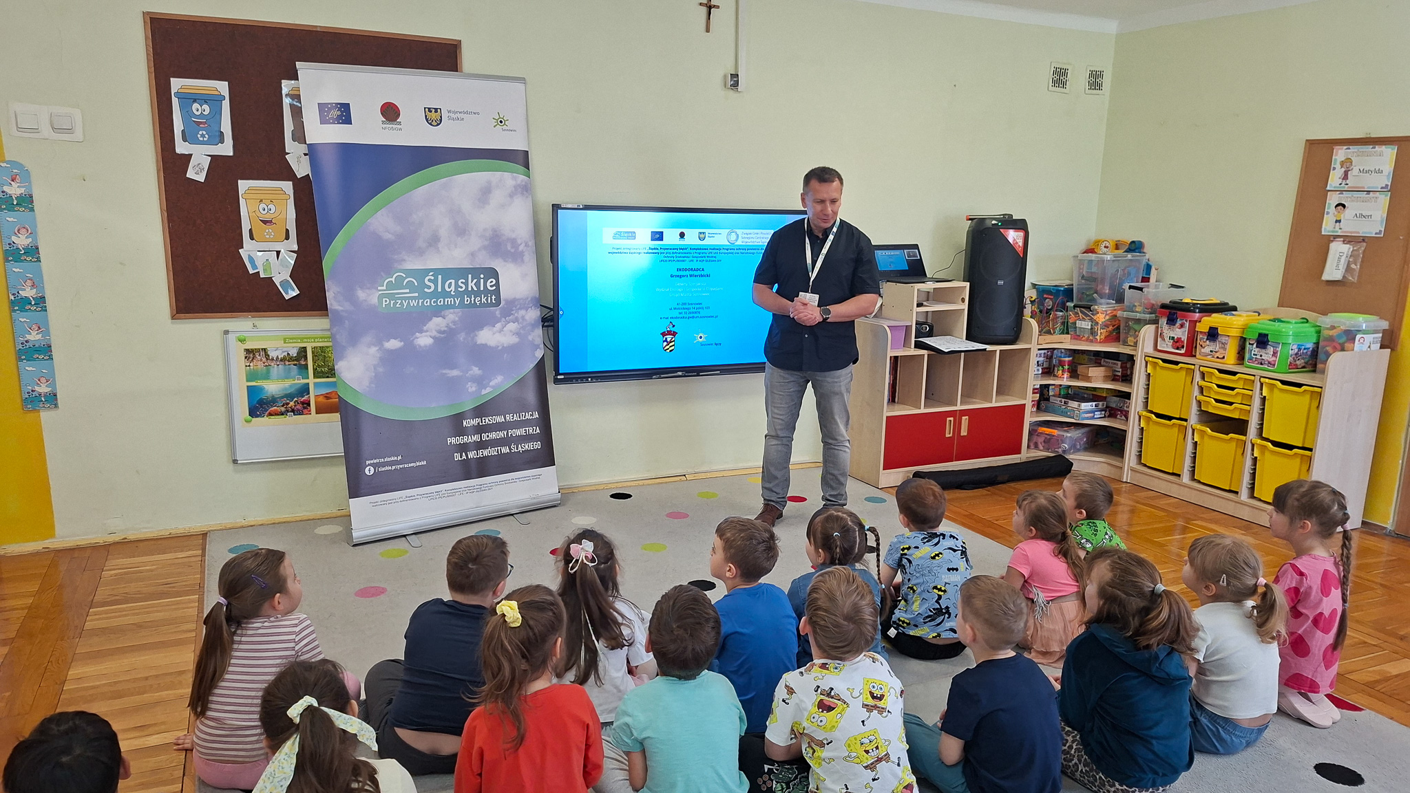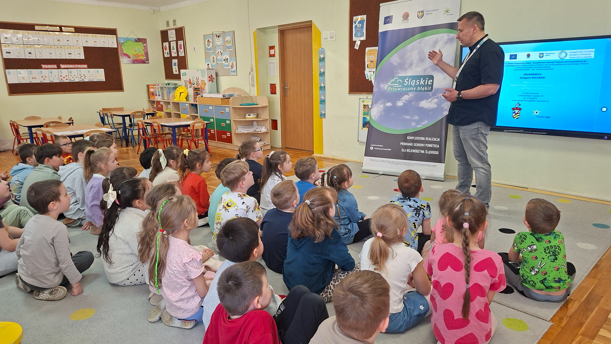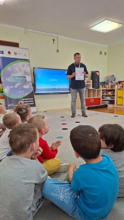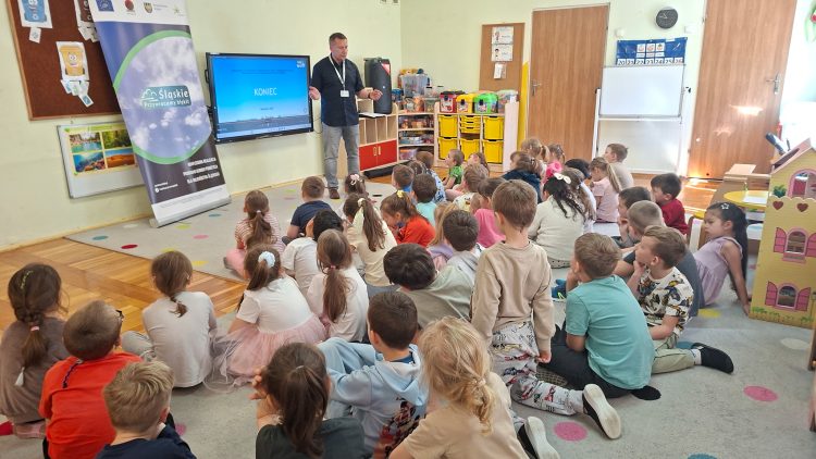 W dniach 23 i 24 kwietnia 2026 r., Ekodoradca odpowiadając na zaproszenia Dyrekcji Przedszkoli Miejskich nr 22 przy ul. Hutniczej 3 i 56 przy ul. Jagiellońskiej 13e w Sosnowcu, kolejno odwiedził te placówki, gdzie przeprowadził Eko prelekcje. Łącznie w obu placówkach w zajęciach brało udział 152 przedszkolaków. Dzieci z poszczególnych grup z ciekawością uczestniczyli w zajęciach realizowanych w ramach projektu: LIFE „Śląskie. Przywracamy błękit”. Wykorzystując między innymi film edukacyjny pod tytułem: „Książę i Smog”, zapoznano przedszkolaków z problematyką zanieczyszczeń powietrza oraz jakie są negatywne skutki SMOG-u dla naszego życia i zdrowia. Wspomniano też co robić i jak reagować kiedy widzimy kogoś kto nieodpowiedzialnie spala odpady. W dalszej kolejności omówiono jak otaczająca nas przyroda wspomaga jakość powietrza i dlaczego warto dbać o otaczającą nasz przyrodę. Przypomniano dlaczego nie wolno wypalać traw, gdzie pożar może w sposób niekontrolowany rozprzestrzenić się na drzewa, które są nam niezbędne do produkcji tlenu. Na koniec zajęć, dzieci potrafiły odpowiedzieć dlaczego tak ważną kwestią jest aby dbać o czyste powietrze i otaczającą nas przyrodę, co tylko z optymizmem pozwala spojrzeć w przyszłość.