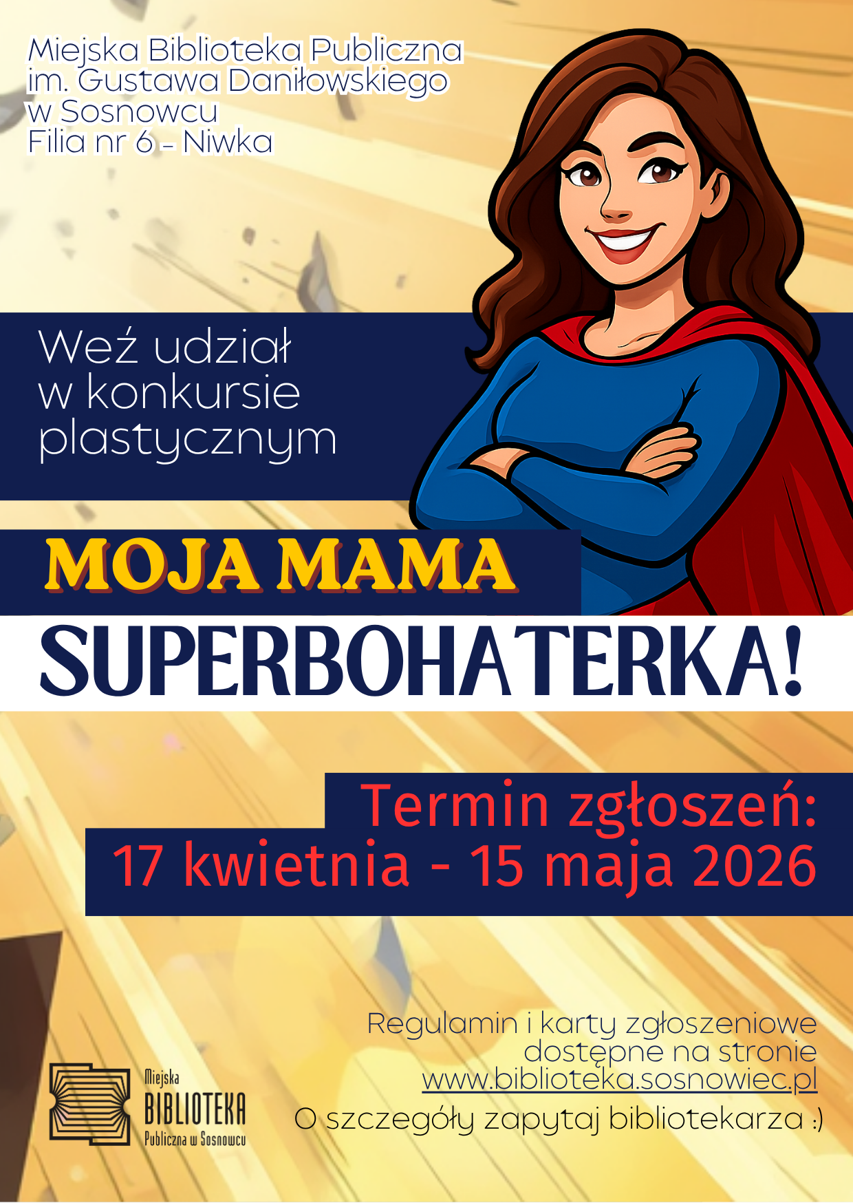 Mogą wziąć w nim udział dzieci zamieszkujące miasta Zagłębia Dąbrowskiego. Zadanie konkursowe polega na wykonaniu pracy plastycznej ukazującej postać mamy jako superbohaterki. W konkursie zostaną przyznane nagrody za zajęcie I, II, III miejsca i ewentualne wyróżnienia. Prace można dostarczyć osobiście lub drogą pocztową do siedziby Filii nr 6 Niwka (ul. Wojska Polskiego 6, 41-208 Sosnowiec) w dniach od 17 kwietnia do 15 maja 2026 wraz z kartą zgłoszenia uczestnika.