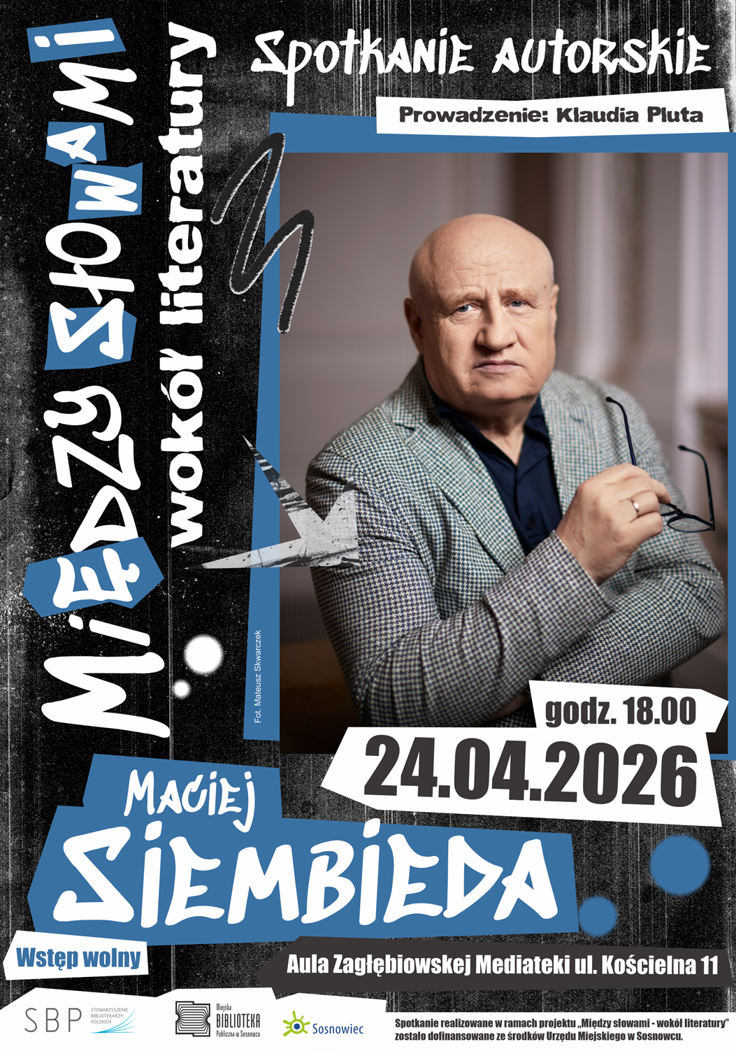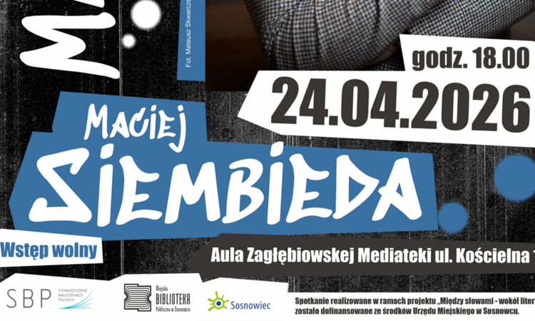 24 kwietnia o godz. 18.00, w ramach projektu „Między słowami – wokół literatury” realizowanego przez Stowarzyszenie Bibliotekarzy Polskich – Zarząd Oddziału w Katowicach oraz Miejską Bibliotekę Publiczną w Sosnowcu, zapraszamy do Zagłębiowskiej Mediateki na spotkanie autorskie z Maciejem Siembiedą.