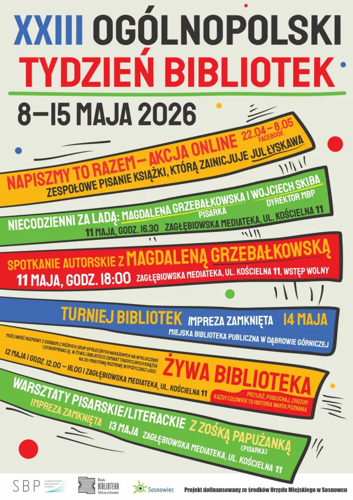 Wszystkie działania realizowane w ramach projektu „Tydzień Bibliotek” zostały dofinansowane ze środków Urzędu Miejskiego w Sosnowcu.Serdecznie zapraszamy! Wszystkie szczegóły znaleźć można na stronie www.biblioteka.sosnowiec.pl
