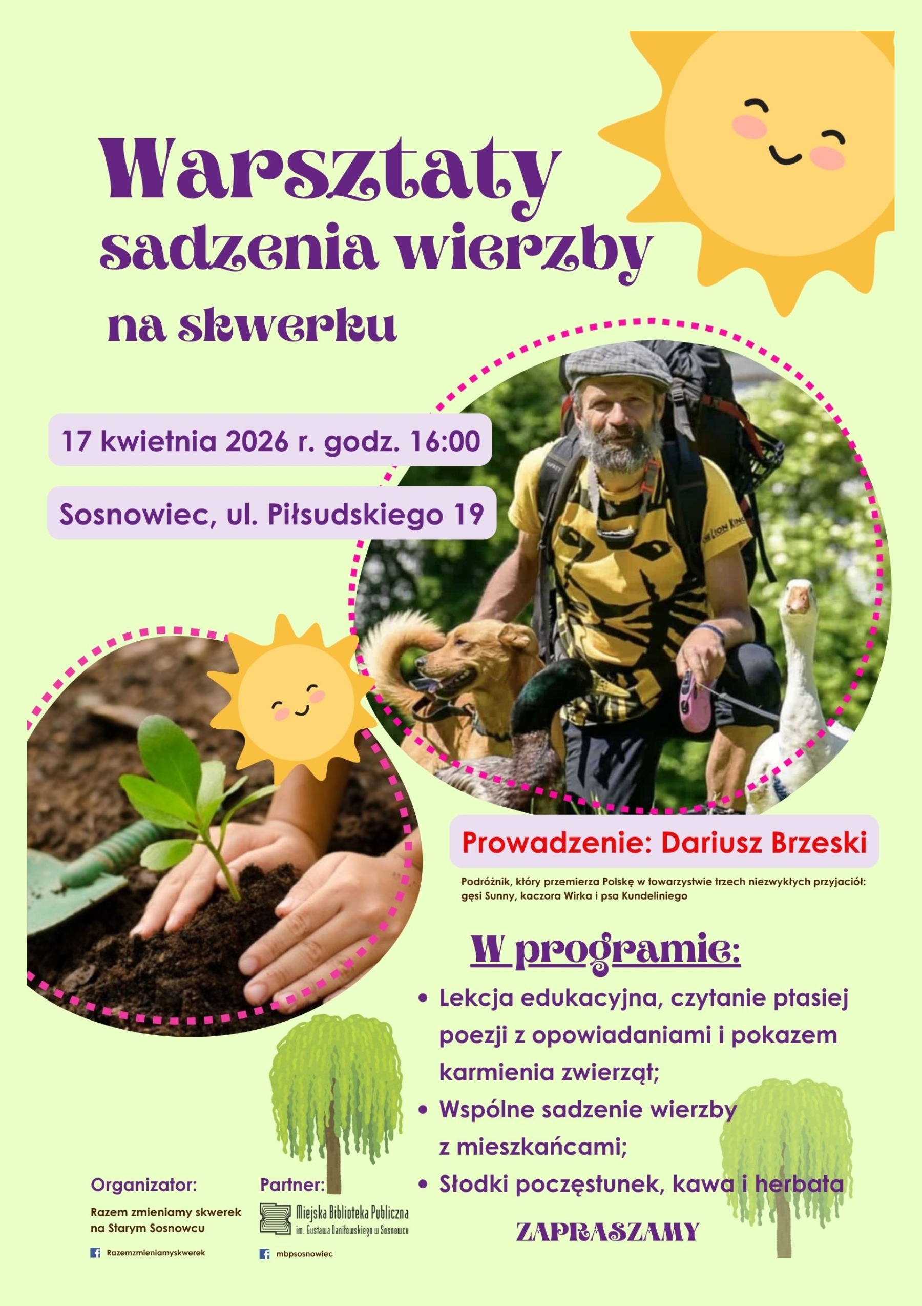 Filia nr 20 – Stary Sosnowiec Miejskiej Biblioteki Publicznej w Sosnowcu (ul. J. Piłsudskiego 19) zaprasza serdecznie 17 kwietnia 2026 o godz. 16.00 na warsztaty sadzenia wierzby, które poprowadzi Dariusz Brzeski – podróżnik, któremu zawsze towarzyszą gęś, kaczor i pies.