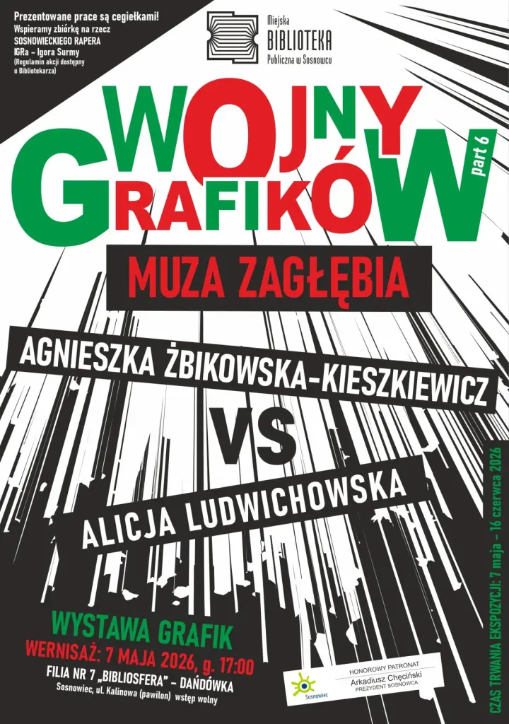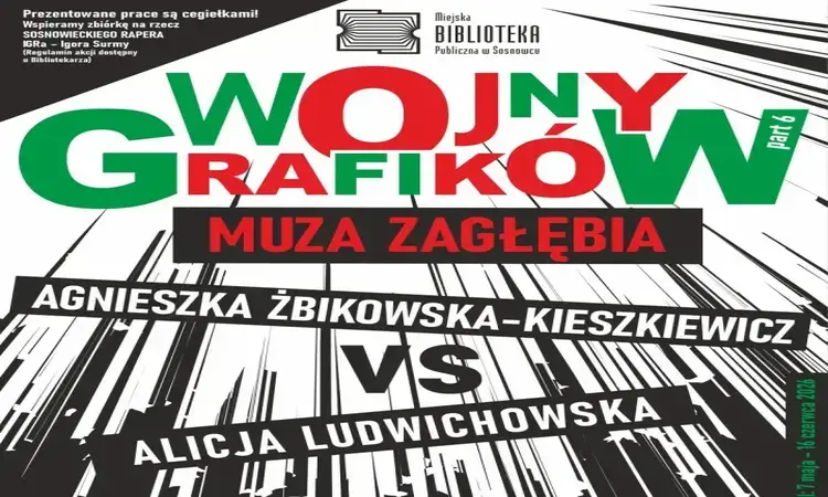 Tym razem wyzwanie pod hasłem „Wojny Grafików! MUZA ZAGŁĘBIA” podejmą Alicja Ludwichowska oraz Agnieszka Żbikowska-Kieszkiewicz.Honorowym patronatem wystawę objął Prezydent Sosnowca – Arkadiusz Chęciński.
