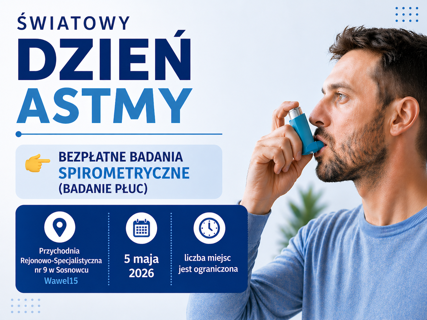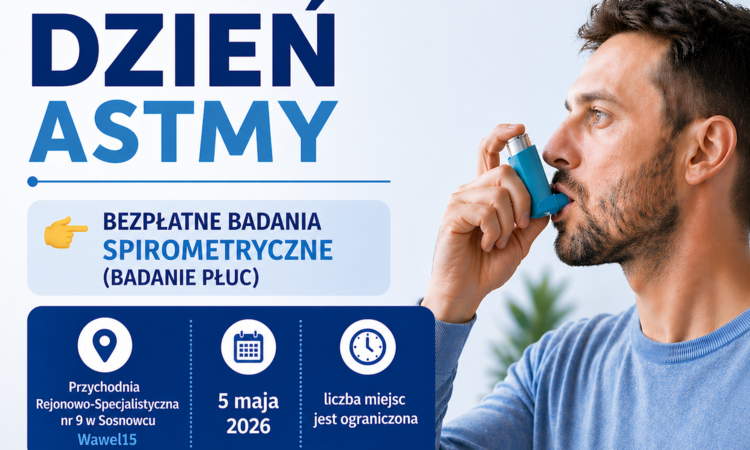 Z okazji Światowego Dnia Astmy 5 maja Przychodnia Rejonowo-Specjalistyczna nr 9 na Wawelu zaprasza na bezpłatne badania spirometryczne (badanie płuc).