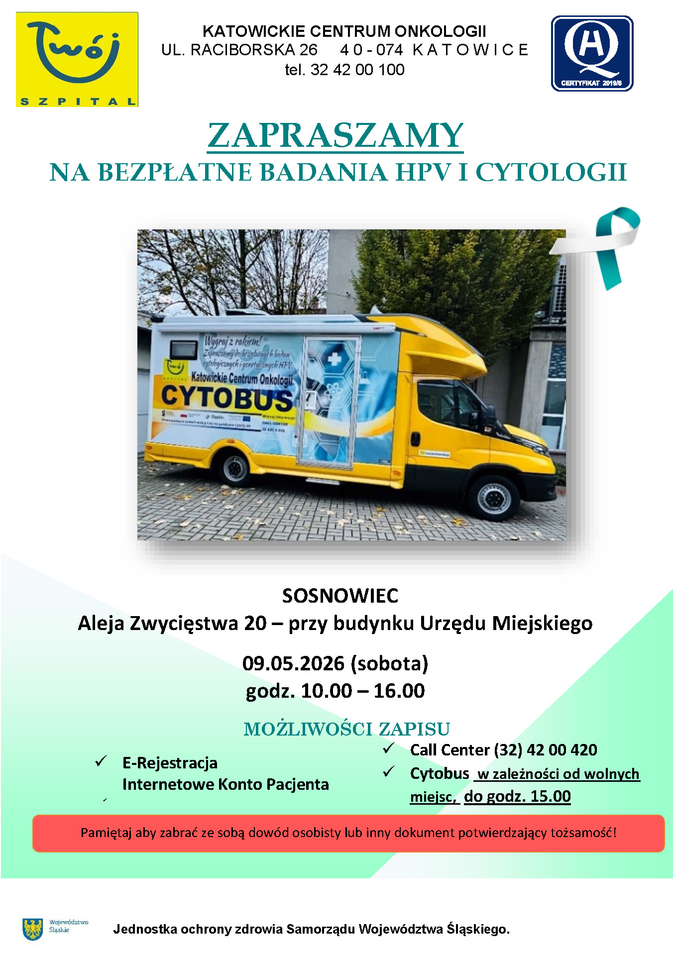 9 maja od godz.10.00 podczas II Sosnowieckiego Forum Zdrowia ze “Zlotem MEDtrucków” przy budynku Urzędu Miejskiego w Sosnowcu stanie także cytobus, w którym Sosnowiczanki będą mogły wykonać bezpłatne badania HPV i cytologii.