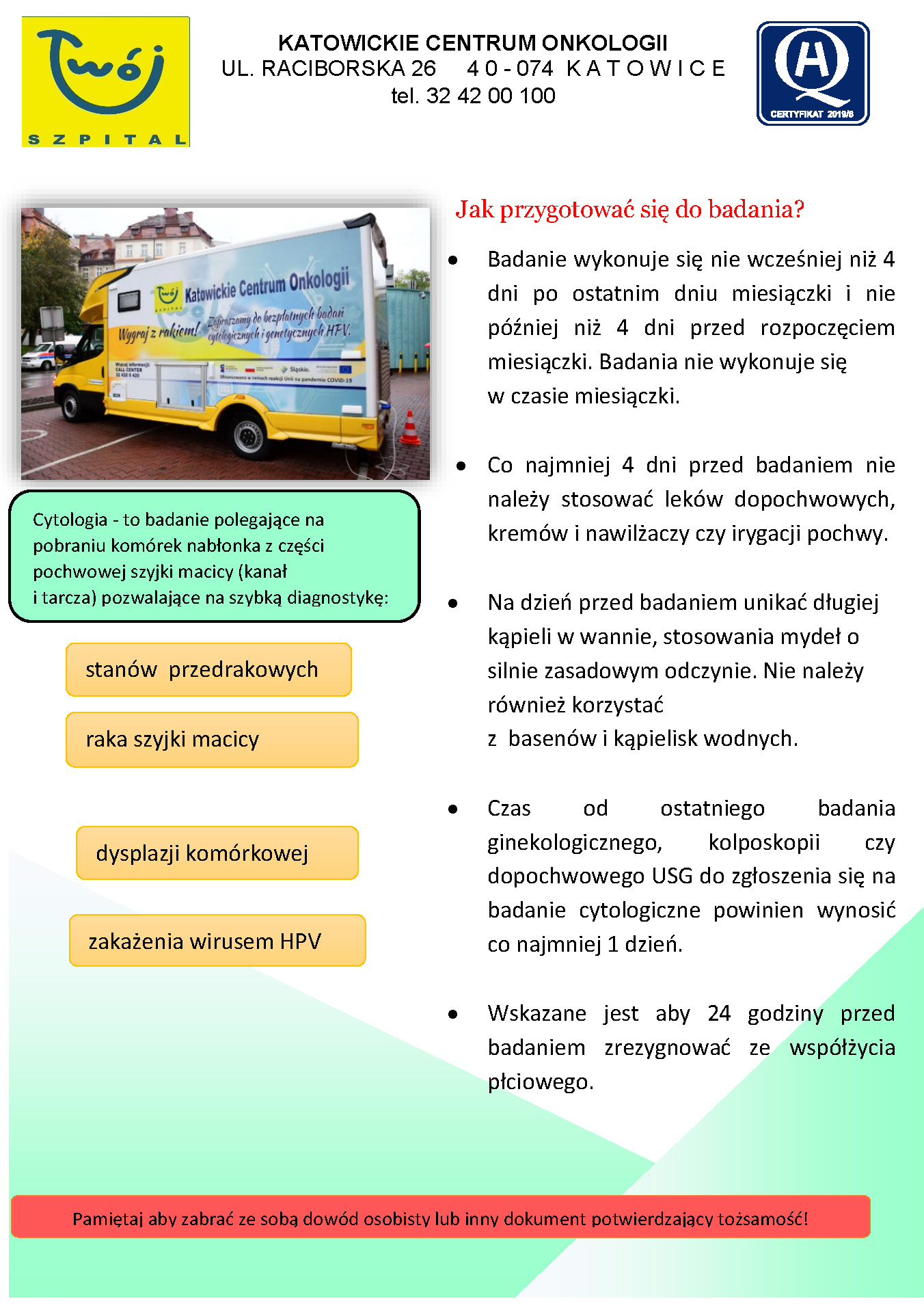 Uwaga! Przesiewowe badania cytologiczne dla kobiet w wieku od 25 do 64 lat. Na te badania wymagana jest rejestracja poprzez stronę internetową Katowickiego Centrum Onkologii lub telefoniczne (32) 42-00-420. Pamiętaj, aby zabrać ze sobą dowód osobisty lub inny dokument tożsamości.
