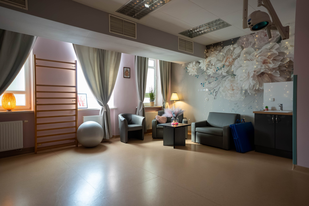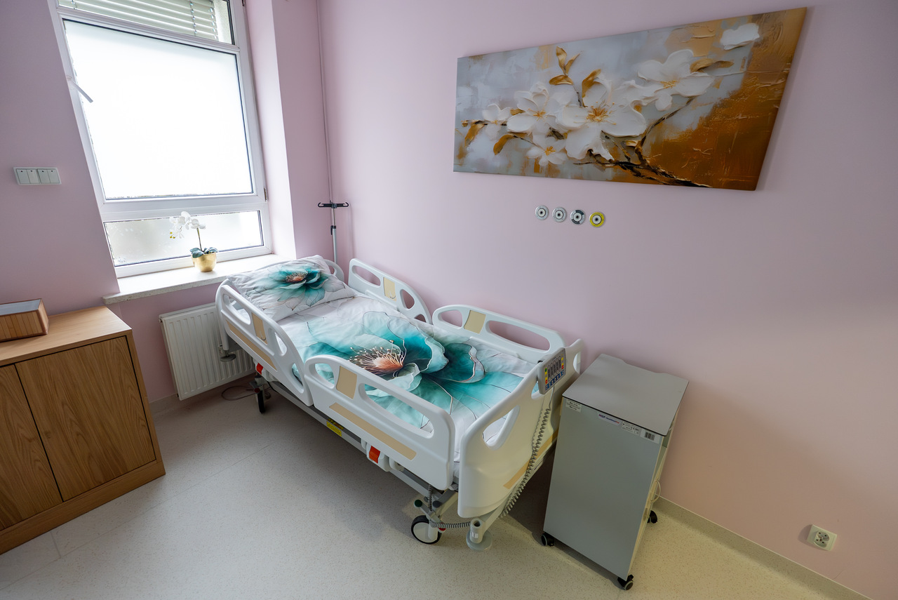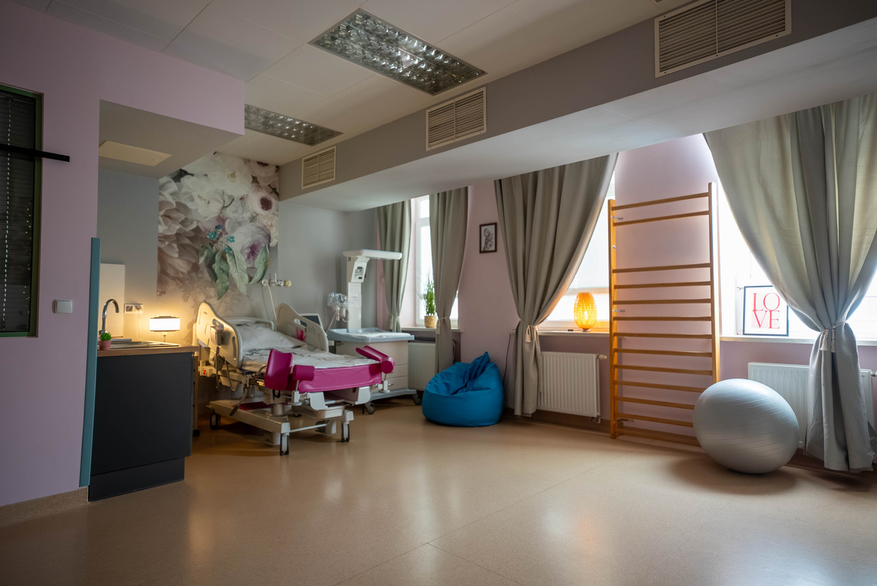 W ramach projektu „Domówka na porodówce” przeprowadzono kompleksową modernizację przestrzeni porodowej i poporodowej, obejmującą remont dwóch sal porodowych, trzech sal poporodowych oraz jednej o podwyższonym standardzie. Nowe przestrzenie zostały zaprojektowane z myślą o komforcie i potrzebach kobiet rodzących – wyposażono je w nowoczesne łóżka porodowe umożliwiające przyjmowanie różnych, także wertykalnych pozycji, które sprzyjają fizjologicznemu przebiegowi porodu. Pojawiły się również elementy wspierające aktywność kobiet, takie jak drabinki, pozwalające na swobodną pracę z ciałem w trakcie porodu. Istotnym uzupełnieniem inwestycji będzie nowoczesna wanna porodowa Hubbard Plus, która umożliwi immersję wodną oraz prowadzenie porodów w wodzie. Zmodernizowane sale poporodowe – w tym sala o podwyższonym standardzie – zapewniają kameralne, przyjazne warunki pobytu, umożliwiając rodzicom wspólne przebywanie z dzieckiem przez cały okres hospitalizacji. Jasne, odświeżone wnętrza oraz nowe wyposażenie sprzyjają regeneracji i budowaniu więzi w pierwszych dniach życia nowej rodziny.
